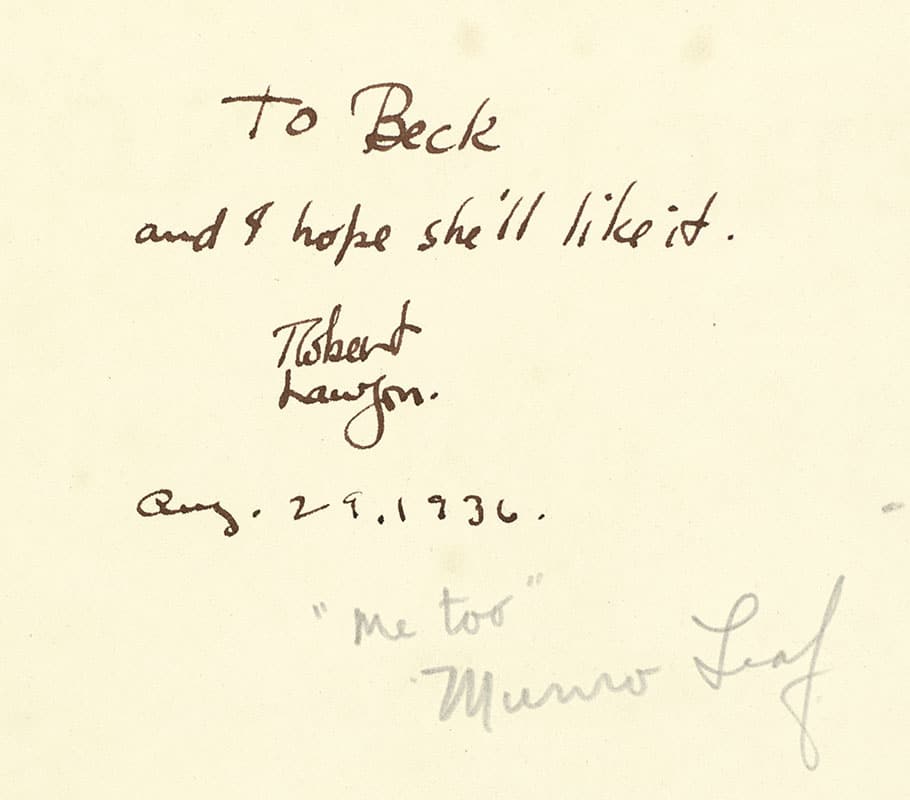 "And for all I know he is sitting there still, under his favorite cork tree, smelling the flowers just quietly": First Edition of "the greatest juvenile classic since Winnie the Pooh"; Inscribed by both Robert Lawson and Munro Leaf and with the original full-page autograph transmittal letter signed and entirely in the hand of Lawson laid in