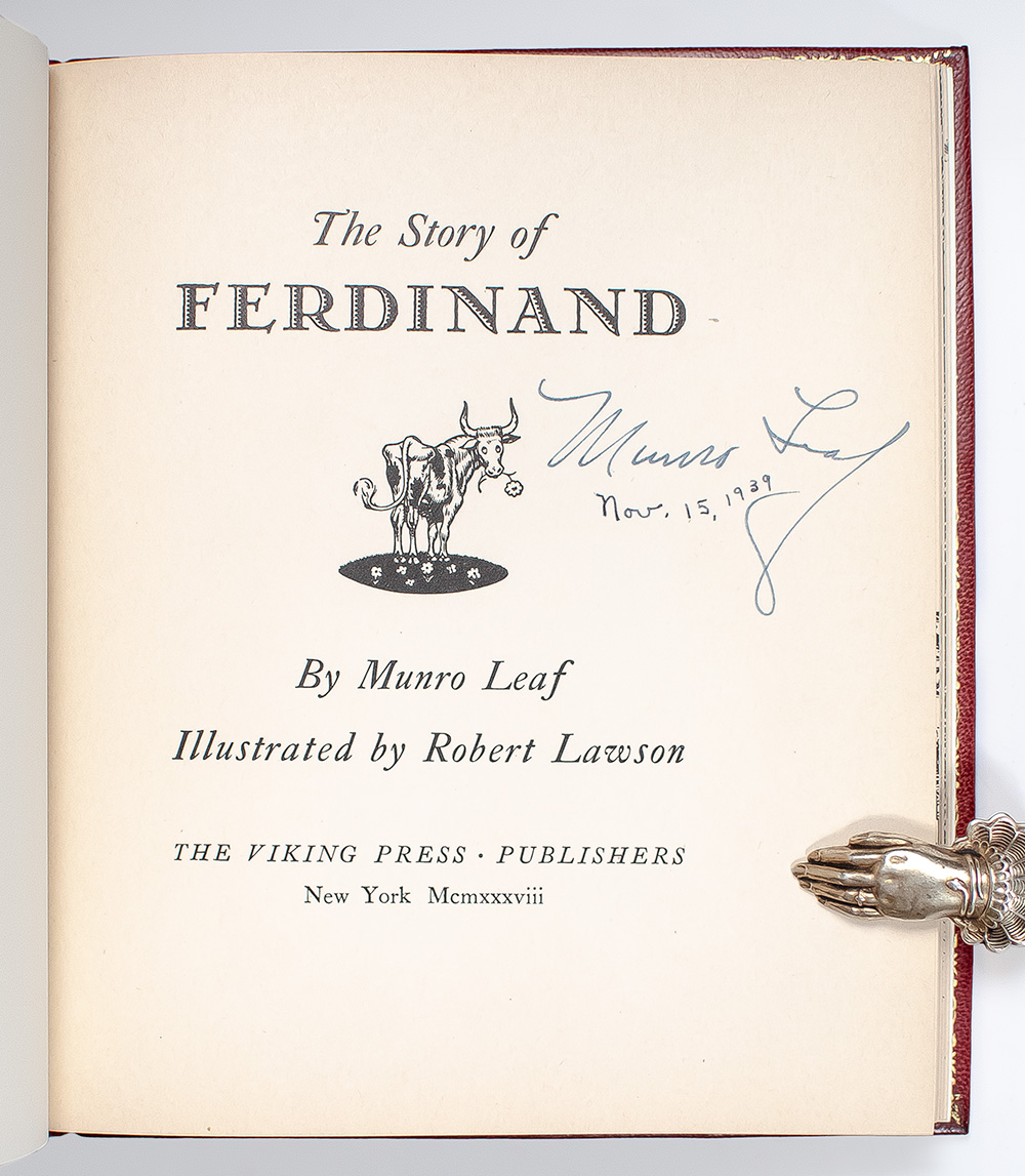 First edition, early printing of Munro Leaf's beloved children's classic. Octavo, bound in full morocco by the Harcourt Bindery, gilt titles and tooling to the spine in six compartments within raised gilt bands, gilt ruling to the front and rear panels, gilt stamped to the front panel, gilt inner dentelles stamp-signed by the Harcourt Bindery, marbled endpapers, all edges gilt. In fine condition. Boldly signed and dated by the author on the title page, "Munro Leaf Nov. 15, 1939." An exceptional presentation. One of the most sought after children's books of the twentieth century, uncommon signed.