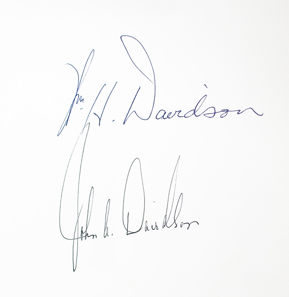 First edition of this history of the legendary motorcycle company published by Harley-Davidson. Quarto, original brown pictorial wrappers, illustrated with black and white photographs. Signed on the title page by both William H. Davidson and John A. Davidson. In near fine condition. Exceptionally rare and desirable signed by both John and William Davidson, who both served as longtime presidents of the iconic company, from the 1940s through the 1970s.