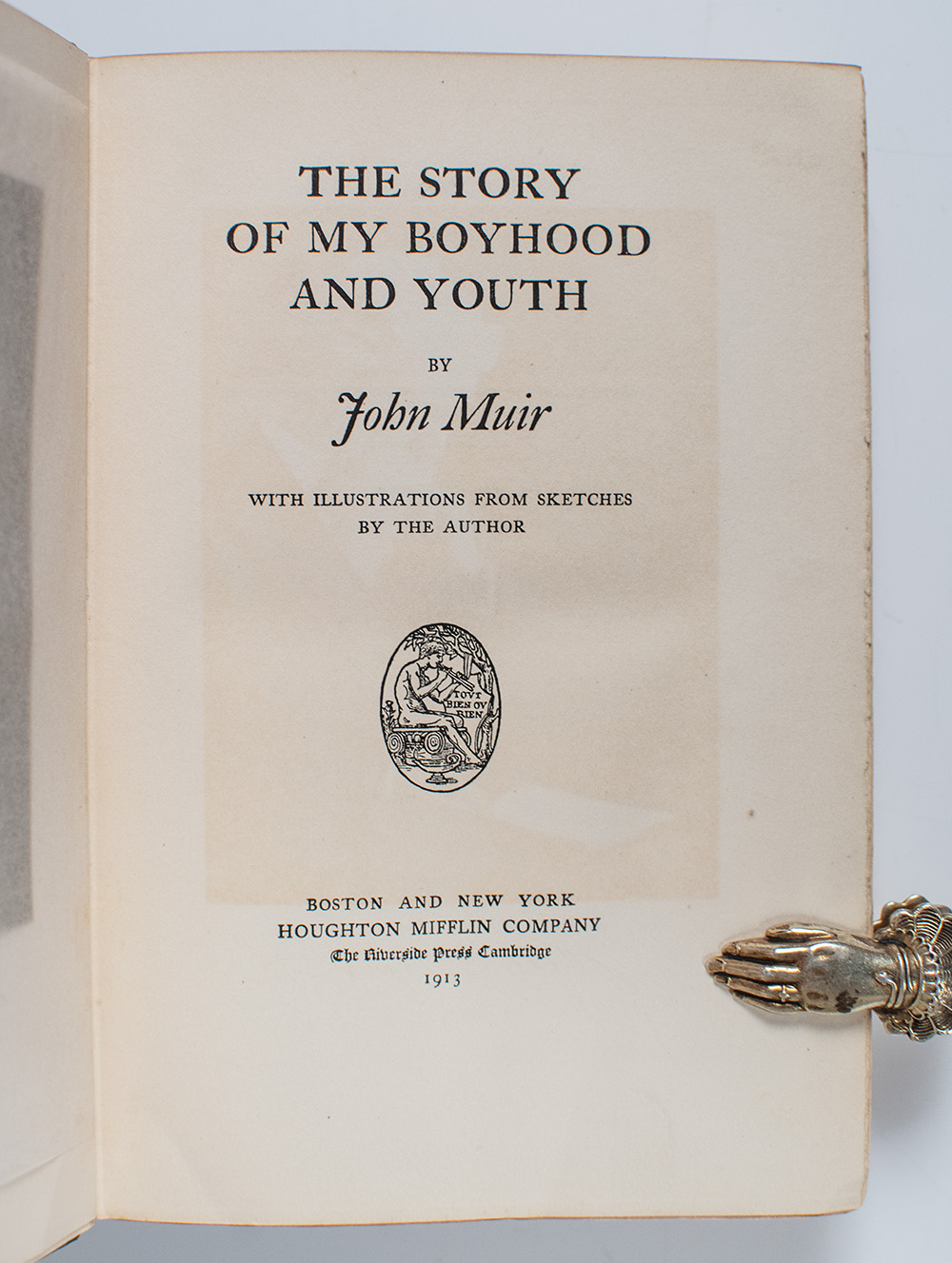 First edition, first issue with the biting criticism of his neighbor's treatment of his son on p. 217: "...none was bold enough or kind enough to break the blacksmith's jaw" (Kimes 315) of Muir's autobiography of his youth. Octavo, original publisher's illustrated cloth with gilt titles and black stamping to the spine and front panel, top edge gilt, tissue-guarded frontispiece portrait of Muir, illustrated. In very good condition, inscription to the front free endpaper.