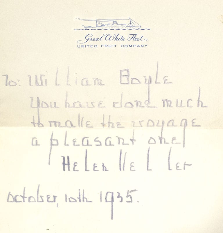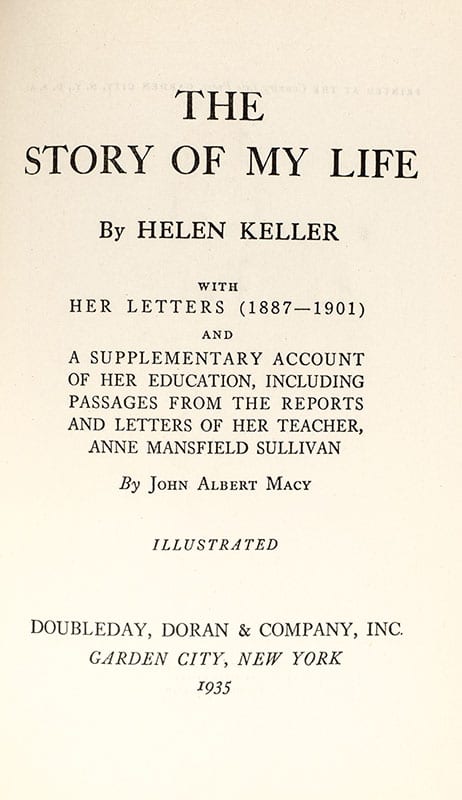Early printing of Keller's autobiography of her early life, particularly detailing her relationship with Anne Sullivan. Octavo, original cloth, engraved frontispiece portrait of Keller after a photograph by Marshall, illustrated. Presentation copy, inscribed by Helen Keller on the front free endpaper, "William Boyle, may all the voyages of your life end happily Helen Keller." Laid in as an autograph letter signed by Keller and entirely in her hand which reads, "To: William Boyle You have done much to make the voyage a pleasant one Helen Kleer October, 10th 1935." Rare a desirable signed and inscribed by Keller.