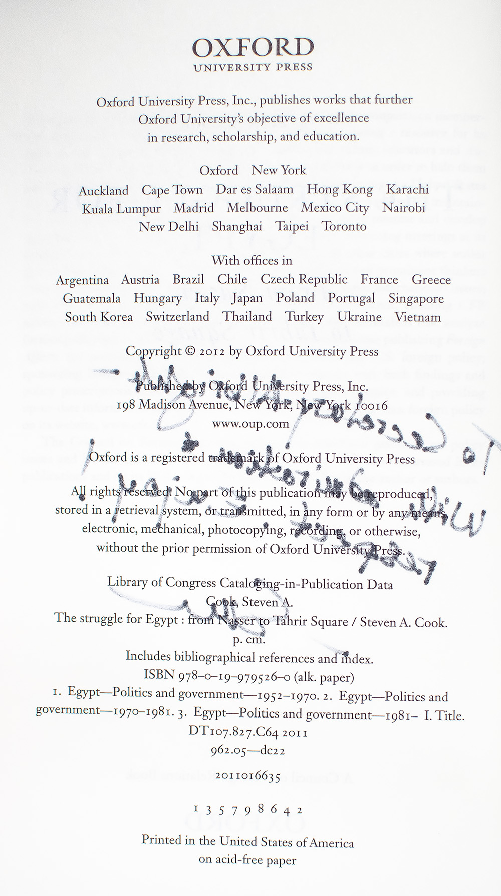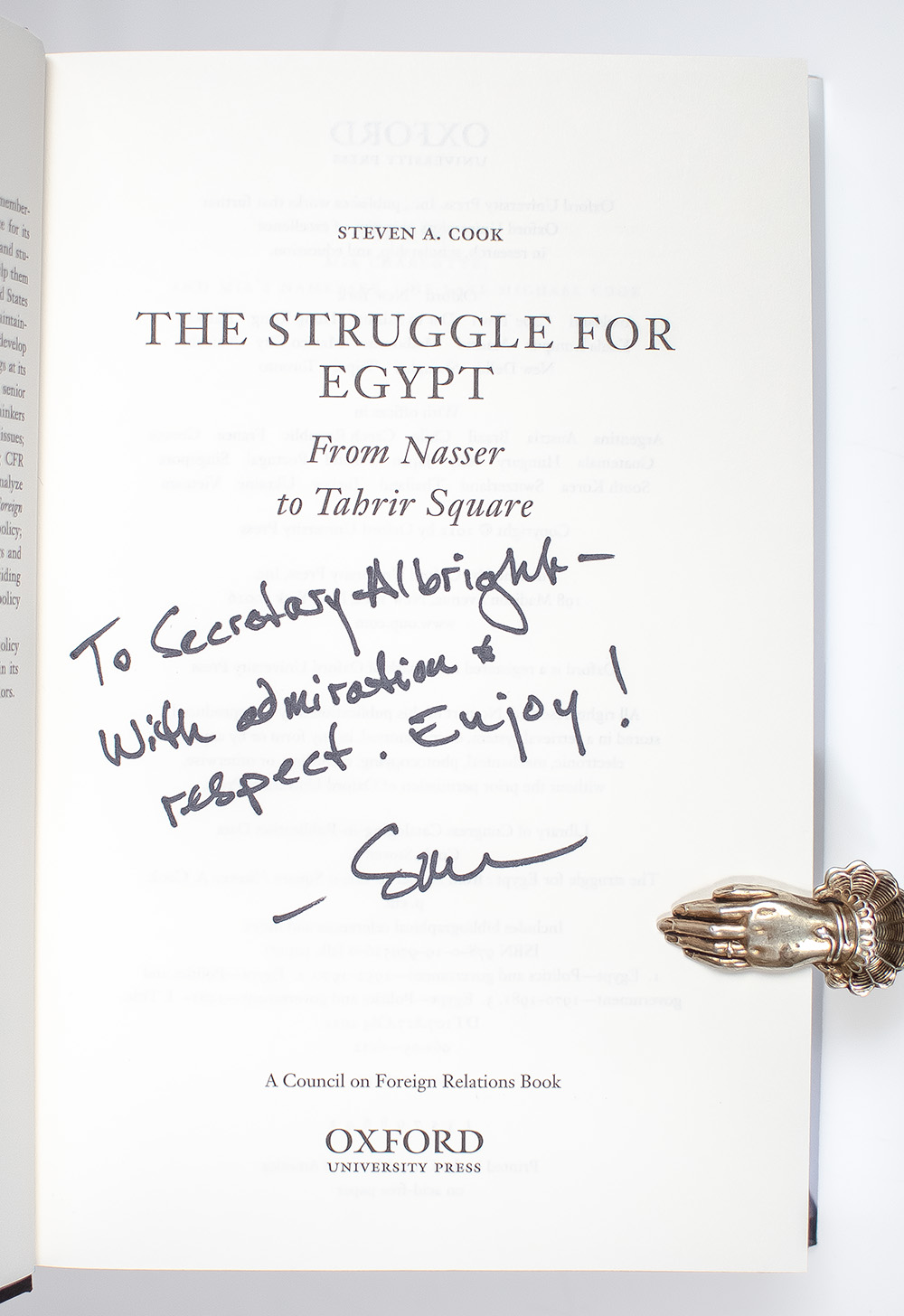 First Edition of The Struggle For Egypt: From Nasser to Tahrir Square; Inscribed by Steven A. Cook to Secretary Madeleine K. Albright