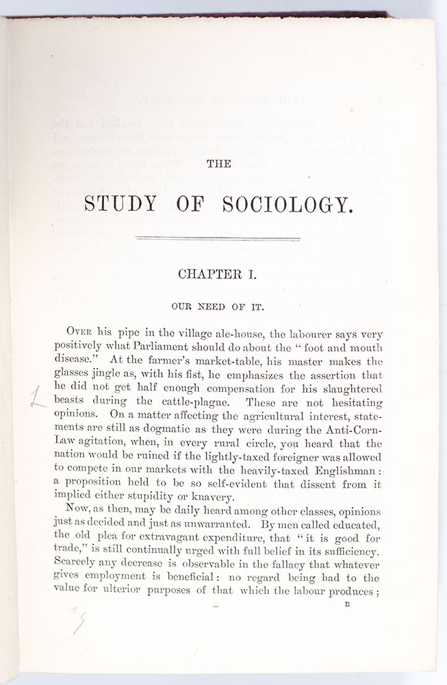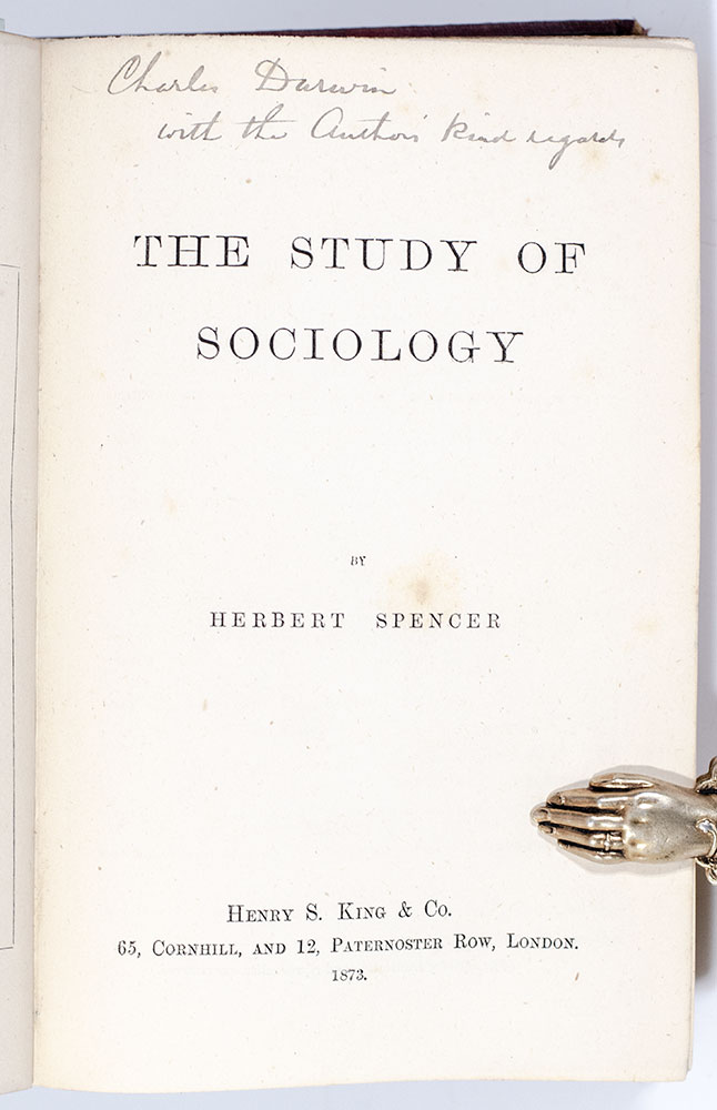 From the library of Charles Darwin: First edition of Herbert Spencer's The Study of Sociology; with a presentation inscription from Spencer to Darwin