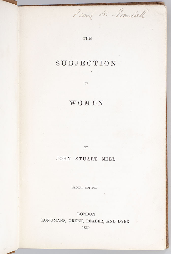 Second edition of Mill's classic work defending the rights of women, published the same year as the first. Octavo, original cloth. In very good condition. Ownership inscriptions.