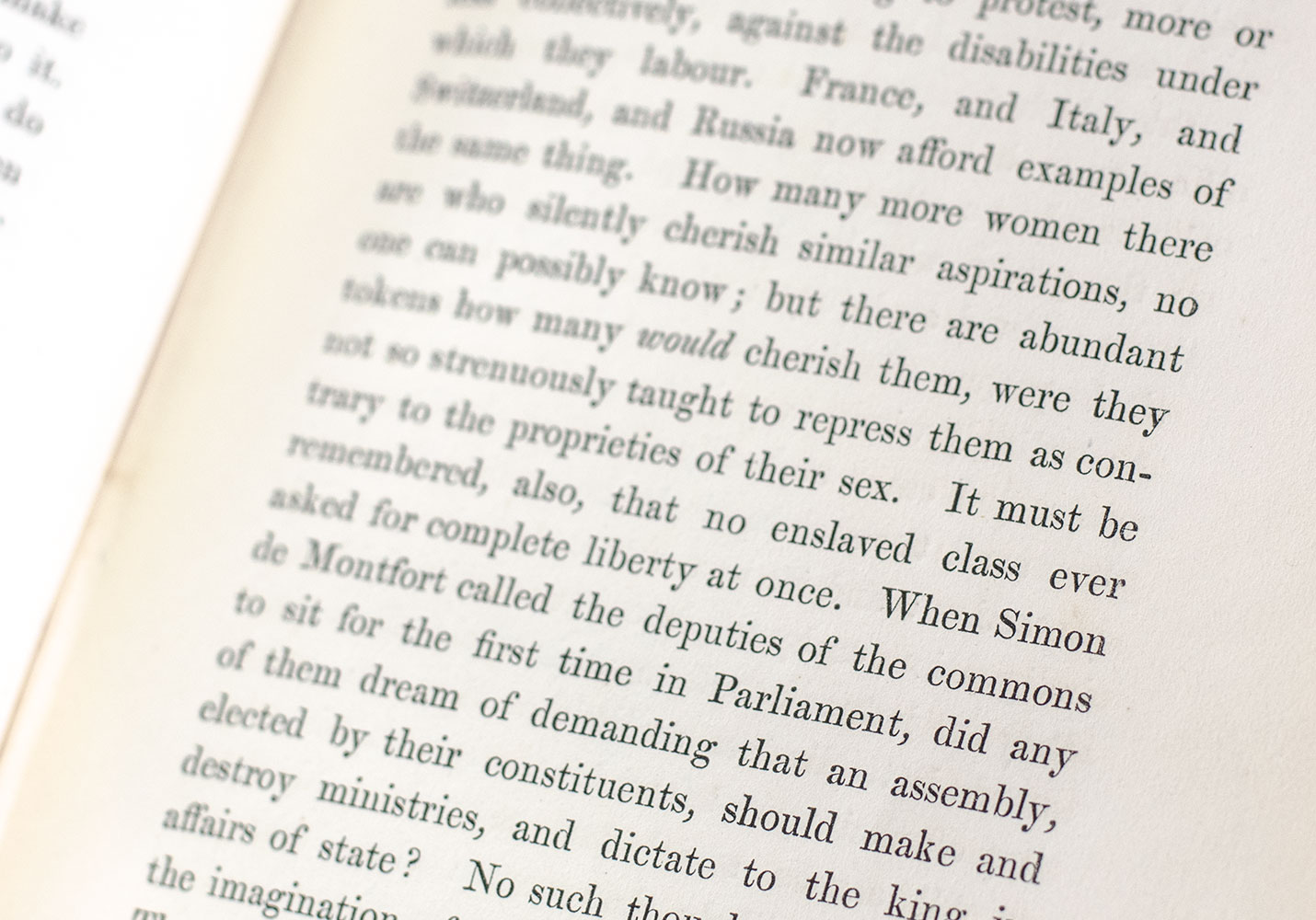 “Many of Mill’s ideas are now the commonplaces of democracy. His arguments for freedom of every kind of thought or speech have never been improved on” (PMM 345). Mill’s wife, Harriet Taylor, proved especially influential in developing this work; her 1851 essay on the enfranchisement of women directly inspired it. “During the seven years of his married life Mill published less than in any other period of his career, but four of his most closely reasoned and characteristic works, Liberty, the Utilitarianism, the Thoughts on Parliamentary Reform and the Subjection of Women… were thought out and partly written in collaboration with his wife” (Britannica). “No one had a more rooted hatred for all oppression [illustrated by] his advocacy of the equality of the sexes” (DNB).