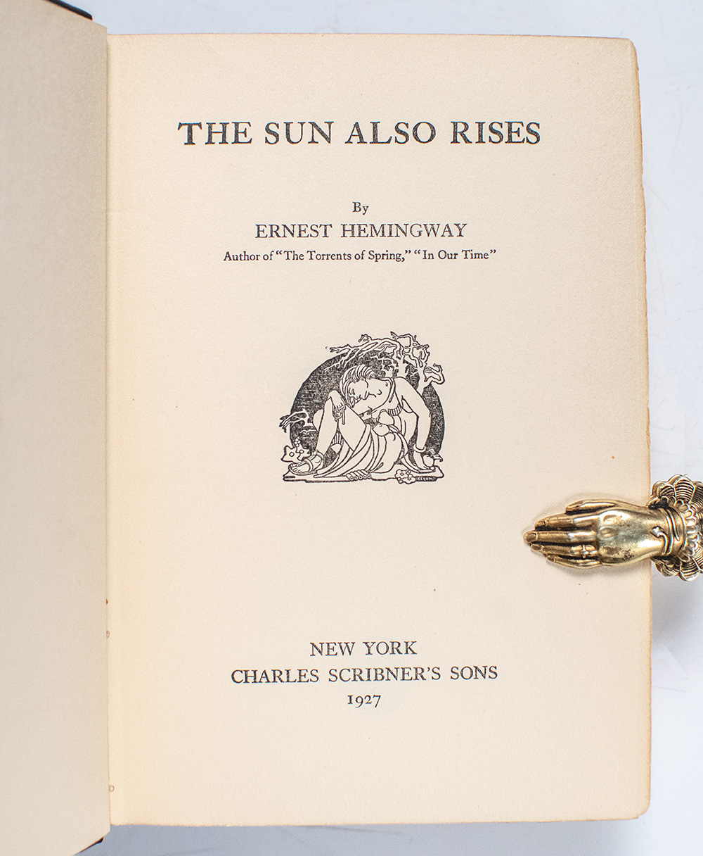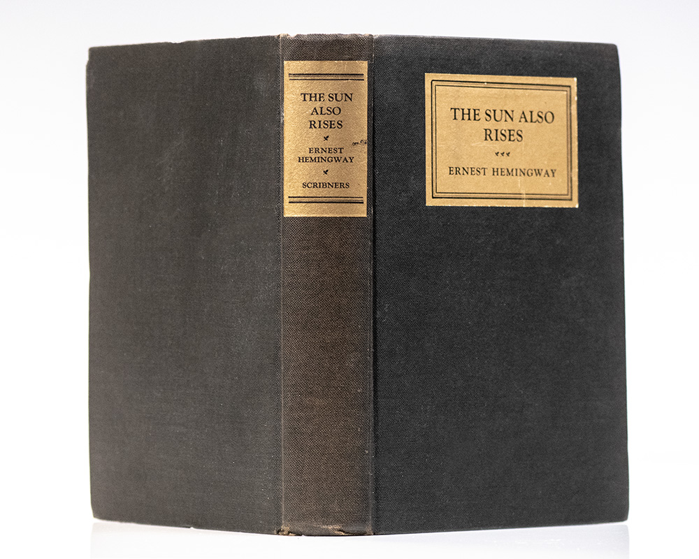 Presentation copy of "Hemingway's greatest work" (Meyers). Octavo, original black cloth with gold paper title labels to the spine and front panel. Association copy, inscribed by the author on the front free endpaper, "To Ruth and Malcom, this little treatise on inconstancy, Ernest Hemingway." The recipients, Ruth White Lowry (1884–1974) and her husband William Malcolm Lowry (1884–1953), were longtime residents of Kansas City, Missouri, and integral members of Ernest Hemingway’s extended Midwestern family. Ruth, the daughter of William White and Mary Hall White, was a first cousin of Grace Hall Hemingway, the author’s mother. This made her Ernest’s first cousin once removed, though their families were close enough that Hemingway referred to her simply as “Cousin Ruth.” The White and Hall families had deep Midwestern roots—Ruth was educated in Kansas City and was part of the city’s civic and cultural life throughout the early twentieth century. When Hemingway and his second wife, Pauline Pfeiffer, returned from Paris to the United States in 1928, they came to Kansas City for the birth of their first child, Patrick Hemingway, who was delivered at St. Mary’s Hospital on June 28 of that year. The Hemingways stayed with Ruth and Malcolm Lowry at their Kansas City home both before and after the delivery. Pauline returned to the same house three years later, in November 1931, for the birth of their second son, Gregory Hancock Hemingway, while Ernest shuttled between Kansas City and Key West during the final stages of Death in the Afternoon. The Lowrys’ hospitality offered Hemingway a familial refuge far from the expatriate world of Europe and the growing celebrity that attended his literary success. The relationship between the two families endured for decades. Letters and family recollections describe Ruth as a warm, maternal presence in Hemingway’s life—a relative he could trust with his young family during periods of upheaval. The Lowry household thus occupies a unique place in Hemingway’s biography: it was the setting for the births of both of his sons with Pauline, and the site of rare domestic calm amid his restless movements between continents. Copies inscribed to members of the Lowry family remain among the most significant Hemingway association copies, linking the author’s private life in the American Midwest to his public identity as one of the central figures of twentieth-century literature. Hemingway's reference in the inscription to the work as a "treatise on inconstancy" gets to the heart of The Sun Also Rises, both in its characters and emotional landscape. Hemingway explores shifting affections, unstable identities, and the transience of postwar life through characters like Brett Ashley, whose romantic attachments drift, and Jake Barnes, whose inner steadiness contrasts the chaos around him. The novel captures the restlessness of the Lost Generation, where relationships, purpose, and even locations feel in constant flux---underscoring a deep yearning for meaning in an unmoored world. In near fine condition. First edition, early printing. An exceptional association.