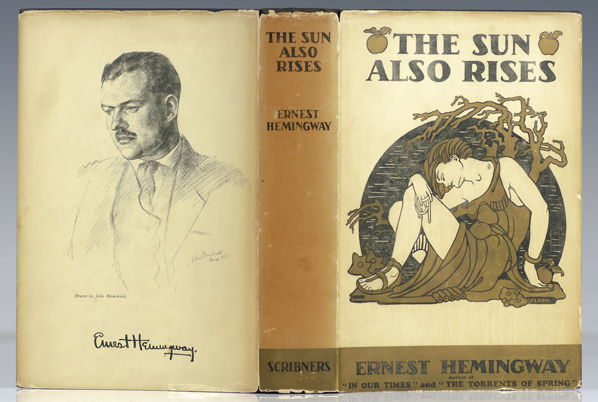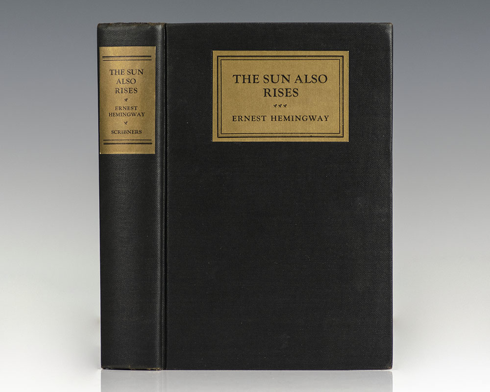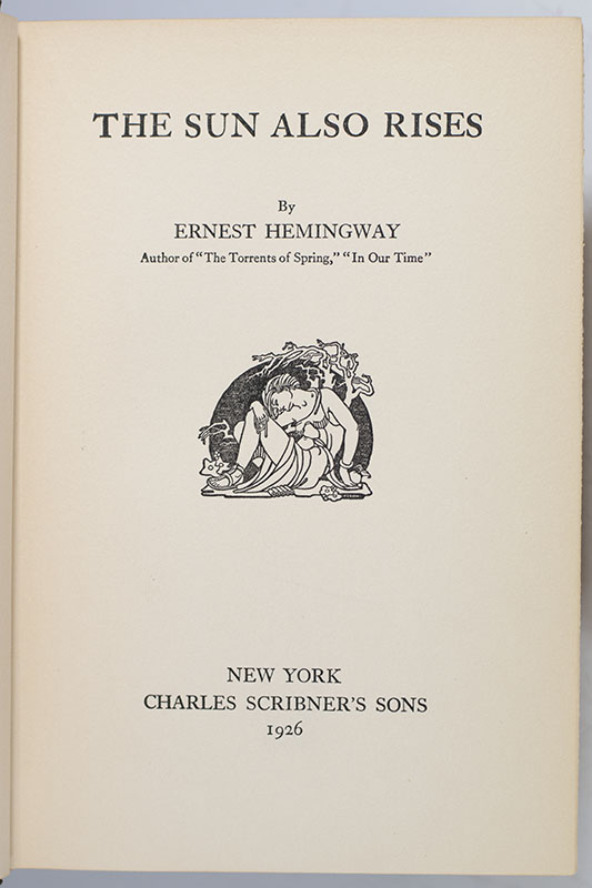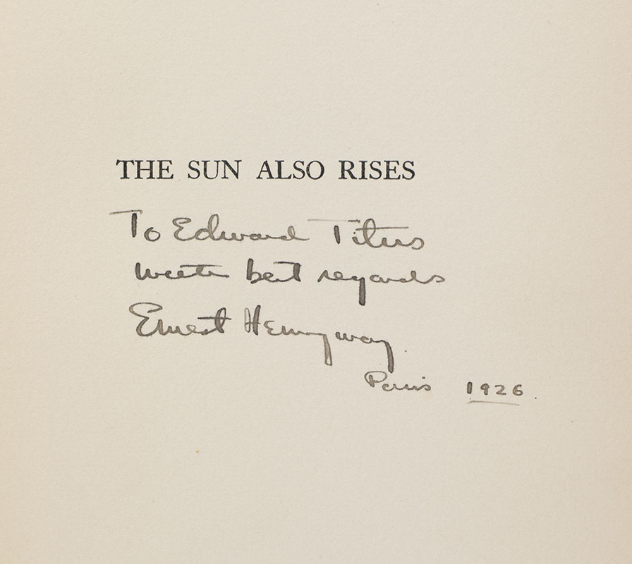 First edition, first issue of the first printing, with the misprint ("stoppped") on page 181 line 26, in the first issue dust jacket with the misprint on the front panel ("In Our Times" vs. "In Our Time"). Octavo, original black cloth. Association copy, inscribed by the author on the half-title page in the year of publication, “To Edward Titus with best regards Ernest Hemingway Paris 1926.” The recipient, Edward Titus was an expatriate publisher of the Black Manikin Press, issuing, among other publications, Kiki’s Memoirs, featuring an introduction by Hemingway. Fine in a near fine first issue dust jacket without any restoration. The Annette Campbell-White copy brought $120,000 at Sotheby's in 2007 and that was not inscribed. Housed in a custom half morocco clamshell box. An exceptional example, most rare and desirable inscribed, especially in the year of publication.