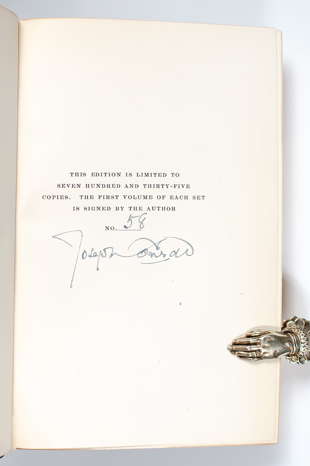 "The sea has never been friendly to man. At most it has been the accomplice of human restlessness": The Sun-Dial edition of the works of Joseph Conrad; one of 735 numbered sets signed by Joseph Conrad in volume one