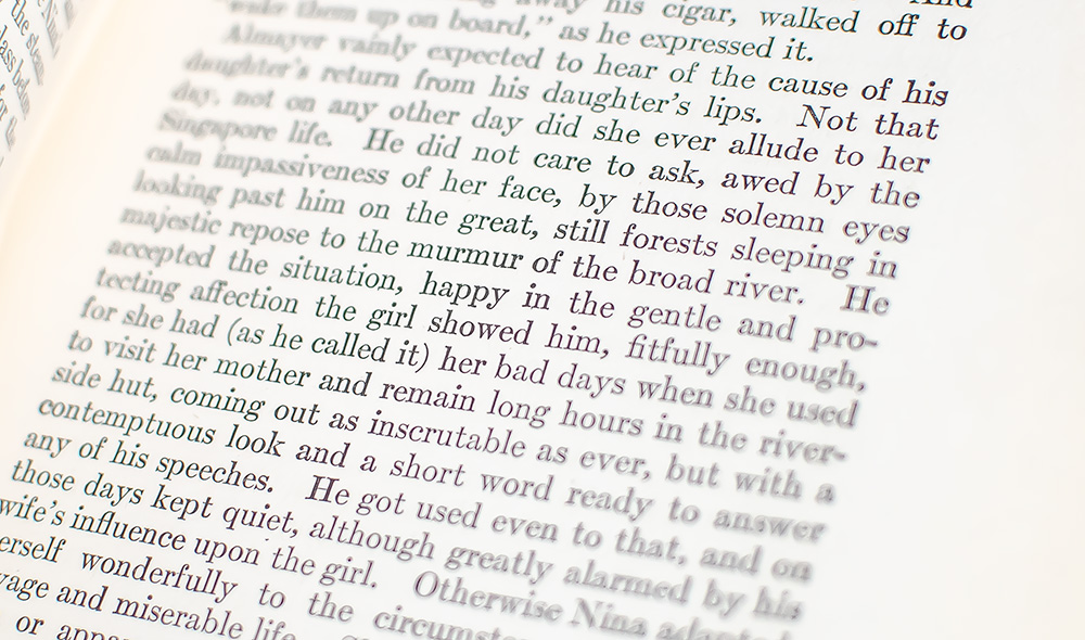 The Works of Joseph Conrad: Almayer's Folly, An Outcast of the Islands, The Nigger of the 'Narcissus', Heart of Darkness, Lord Jim, Typhoon, Falk, Youth, Nostromo, The Secret Agent, The Mirror of the Sea, Under Western Eyes, Chance, Victory, The Shadow Line, The Arrow of Gold, The Rescue, The Rover, Suspense.