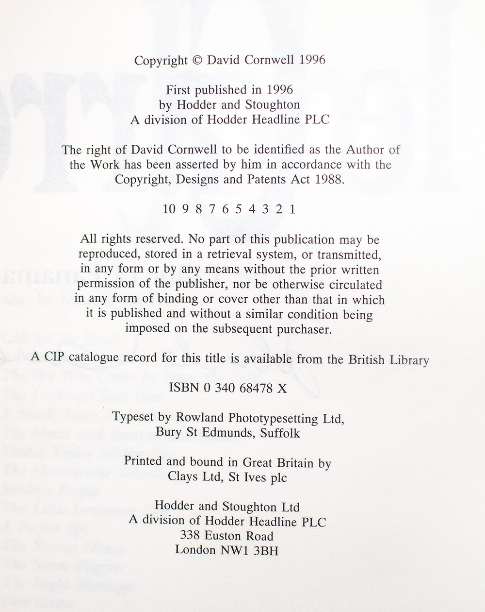 First edition of this "tour de force in which almost every convention of the classic spy novel is violated" (The New York Times). Octavo, original half cloth, pictorial endpapers. Boldly signed by John le Carre the title page. Fine in a fine dust jacket.