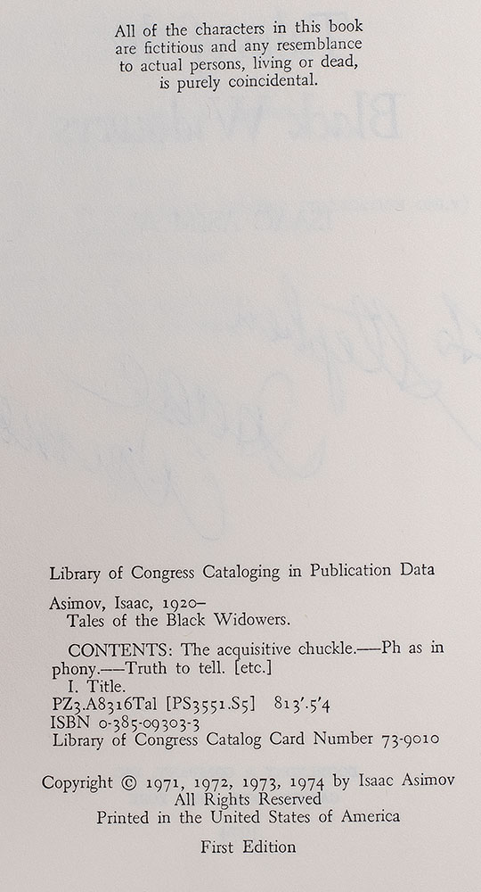 First edition of the first book in Asimov's Black Widowers series. Octavo, original cloth. Presentation copy, inscribed by the author on the title page, "To Stephen Isaac Asimov." Very good in a very good dust jacket. Jacket design by Wendell Minor.