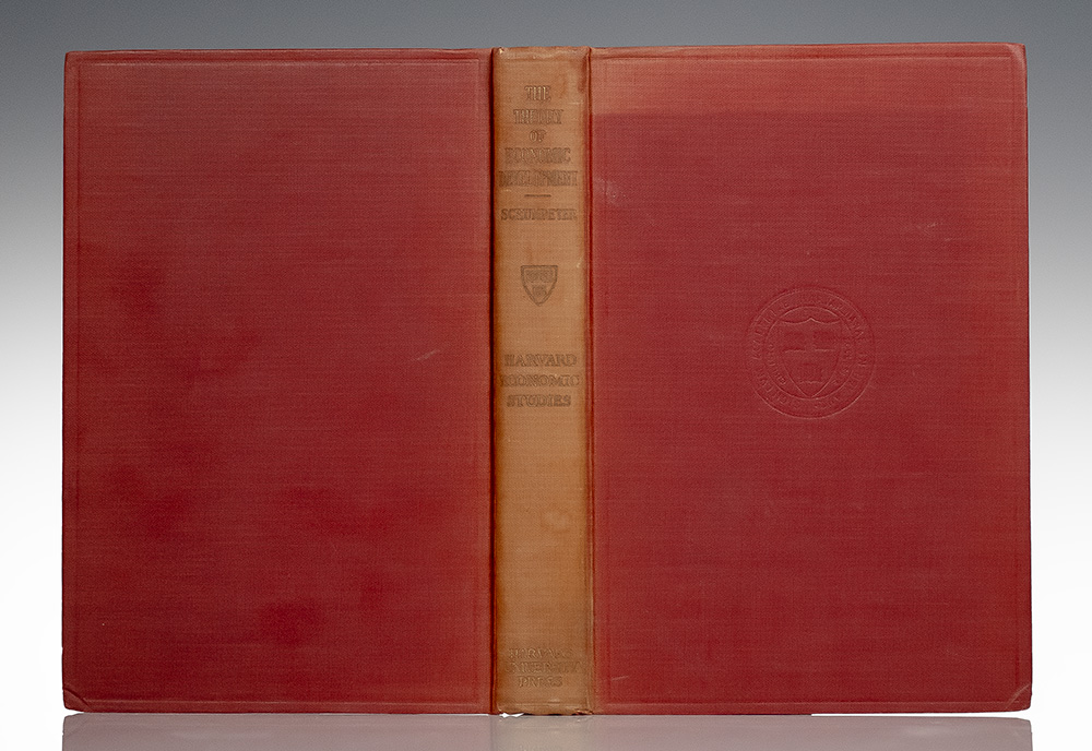 First edition of the economist's classic work, the author's earliest substantial version of what came to be known as the Schumpeterian system. Octavo, original cloth. In very good condition, toning to the spine. From the library of economist Tom E. Davis, with his name to the front free endpaper. Davis was a economics professor and chair of the economics at Cornell University and was an expert on economic development in Latin America. First editions are uncommon.