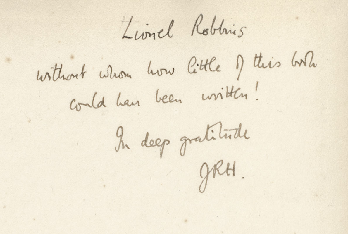 First edition of this classic microeconomic statement of wage determination in competitive markets and major contribution to economic theory. Octavo, original cloth. Association copy, inscribed by the author to the British economist Lionel Charles Robbins, head of economics at the London School of Economics on the front free endpaper, “Lionel Robbins without whom how little of this book could have been written! In deep gratitude, JRH." It would be hard to exaggerate the influence of Lionel Robbins and that of the wider “Robbins circle” at the LSE during 1930s on the development of John Hicks into one of leading pure economic theorists of the twentieth century. Hicks credited Robbins with initiating his interest in economic theory, stating in his ‘Commentary’ in the 1963 edition of The Theory of Wages that “... he moved me from Cassel to Walras and Pareto, to Edgeworth and Taussig to Wicksell and the Austrians – with all of whom I was more at home at that stage than I was with Marshall and Pigou” (p. 306). Although Hicks left for Cambridge in 1935, he would later tell Robbins “that his years at LSE were ‘the formative years of my life as an economist; I do not think I have had as important years since’” (quoted in Howson, p. 252). The Theory of Wages was “ostensibly a book about labour economics but some of its elements, such as the ‘elasticity of substitution’ and its connection with the relative income shares of labor and capital, proved to have a much wider application to the general theory of distribution” (Blaug). Robbins played a key role in bringing the work to print, writing a "strong recommendation for publication to Macmillan, which agreed to publish it but only after a report from a second reader (D.H. Robertson) after an unenthusiastic one from Keynes” (Howson, p. 167). Writing in his Autobiography of an Economist, Robbins would describe the book as "bursting with ideas which, if they have not all proved to be ultimately defensible, were certainly novel” (p. 129). In near fine condition. An exceptional association on this landmark work, which anticipates a number of developments in distribution and growth theory and remains a standard work in labour economics.