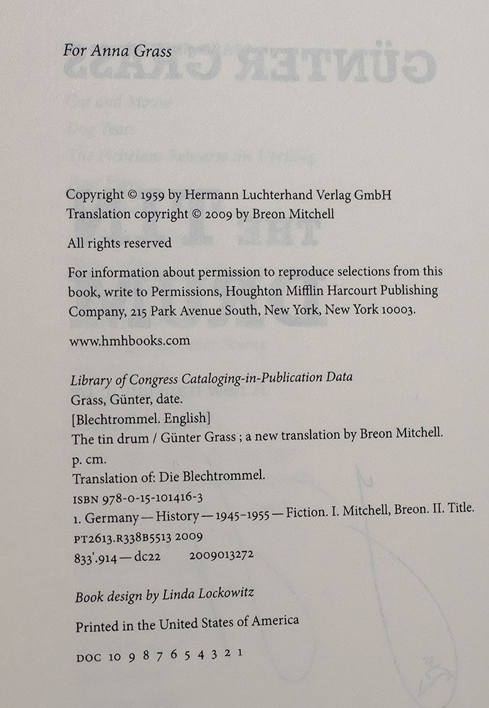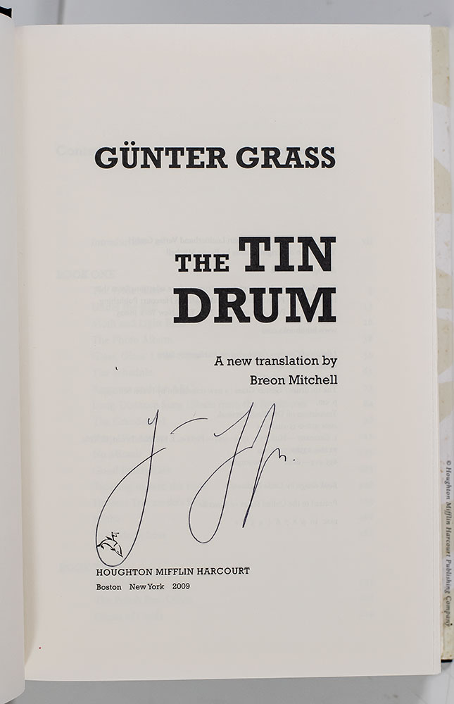 First edition of the fiftieth anniversary edition of the author's masterpiece. Octavo, original boards. Boldly signed by Gunter Grass on the title page. Translated by Breon Mitchell. Fine in a fine dust jacket. Jacket art by Gunter Grass. Jacket design by Michaela Sullivan. Author photograph by Hans Grunert.