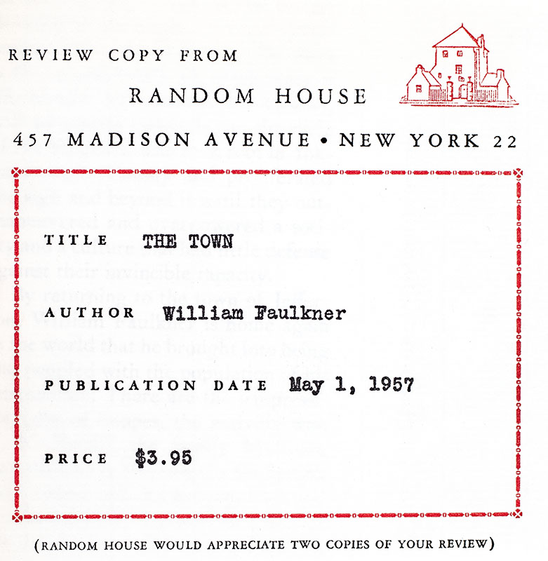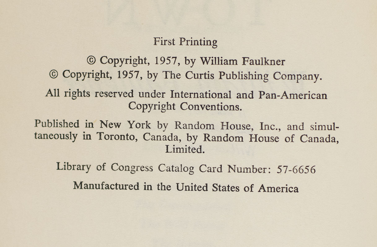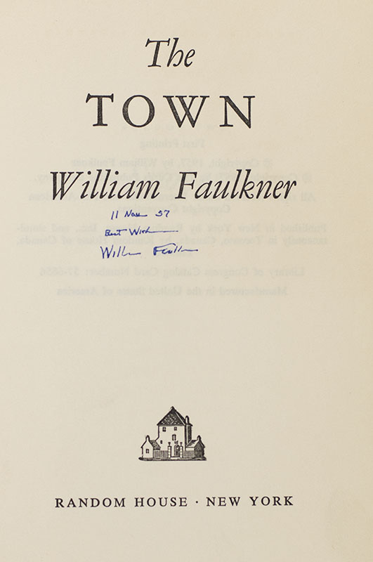 "Poets are almost always wrong about facts. That's because they are not really interested in facts: only in truth": First Edition of William Faulkner's The Town; Signed by Him in the year of publication