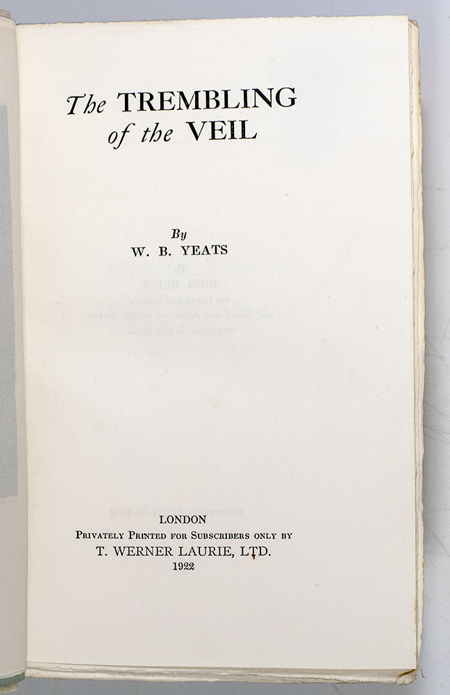 One of the foremost figures of 20th-century literature, William Butler Years was a pillar of the Irish literary establishment and a driving force behind the Irish Literary Revival. The Trembling of the Veil was the second of Yeats's seven autobiographical works, and was described by Arthur Symons as "an absolute masterpiece: far & away the best thing Yeats has ever done" (Ross, p. 559). The following year, Yeats was awarded the Nobel prize for literature.