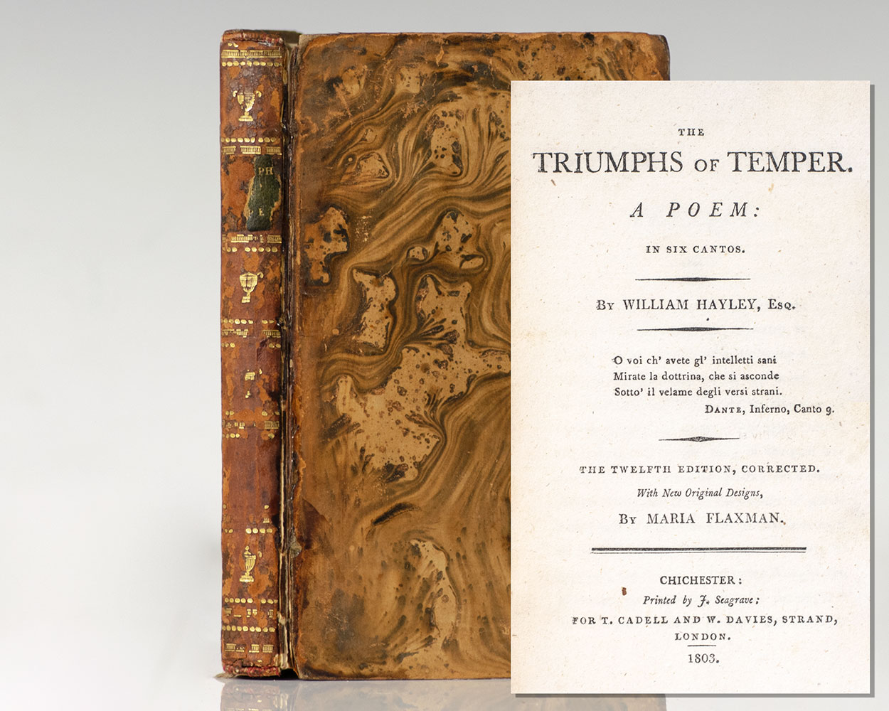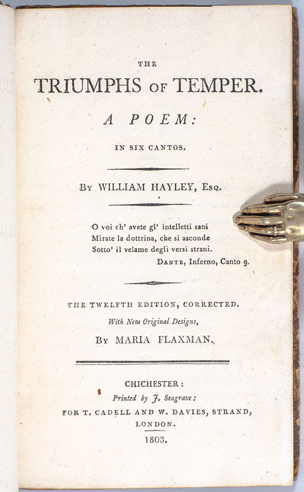 Finely bound example of Hayley's immensely popular work. 12mo, bound in full contemporary tree calf with gilt tooling to the spine, morocco spine label lettered in gilt, gilt turn-ins, illustrated with beautiful plates by William Blake from designs by Maria Flaxman. In good condition. Bookplate.