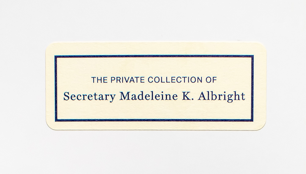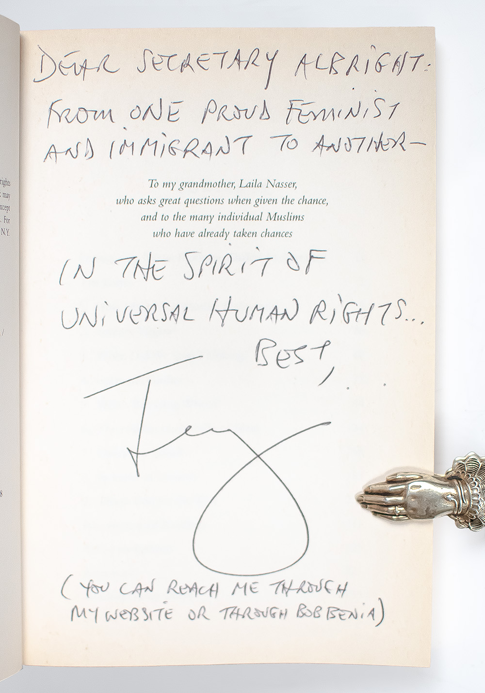 First edition of this deeply personal critique of contemporary Islam. Octavo, original publisher's wrappers. Presentation copy, inscribed by author on the dedication page, "Dear Secretary Albright: From one proud feminist and immigrant to another- in the spirit of universal human rights... Best, Irshad (you can reach me through my website or through Bob Benia)." With an autograph letter signed by the author to Albright laid in. The recipient, Madeleine K. Albright was the first woman to serve as the U.S. Secretary of State. She acted under President Bill Clinton from 1997 to 2001, leading the United States through foreign policy in the Middle East with the endorsement of military action in Iraq. At the 1998 NATO summit, Albright coined the “3 Ds” of NATO, “which is no diminution of NATO, no discrimination and no duplication – because I think that we don’t need any of those three “Ds” to happen.” After her tenure as Secretary of State, she served as chair of the consulting Albright Stonebridge Group and was the Michael and Virginia Mortara Endowed Distinguished Professor in the Practice of Diplomacy at Georgetown University’s School of Foreign Service. For Albright’s contributions to foreign policy and relations that defined a century, President Barack Obama awarded her the Presidential Medal of Freedom in 2012. Fine in a fine dust jacket. Bookplate to the front pastedown from, “The Private Collection of Secretary Madeleine K. Albright.” Cover photograph by Lynn Goldsmith. Cover design by Henry Sene Yee.