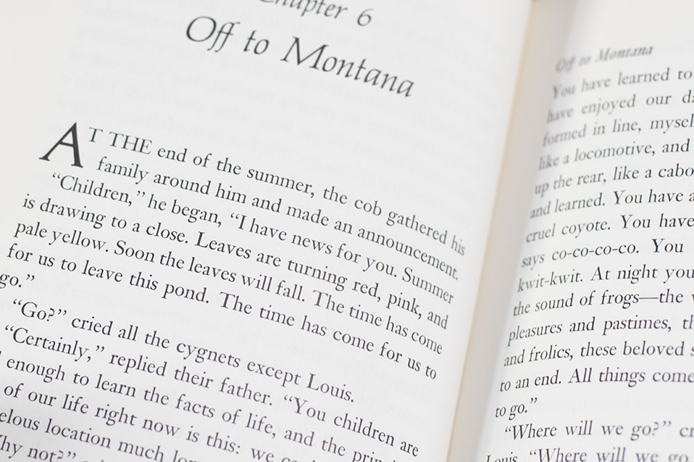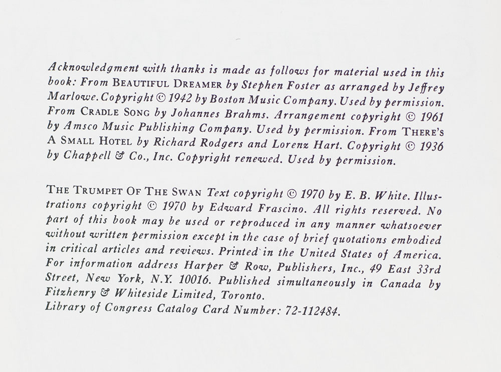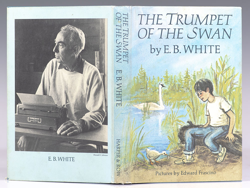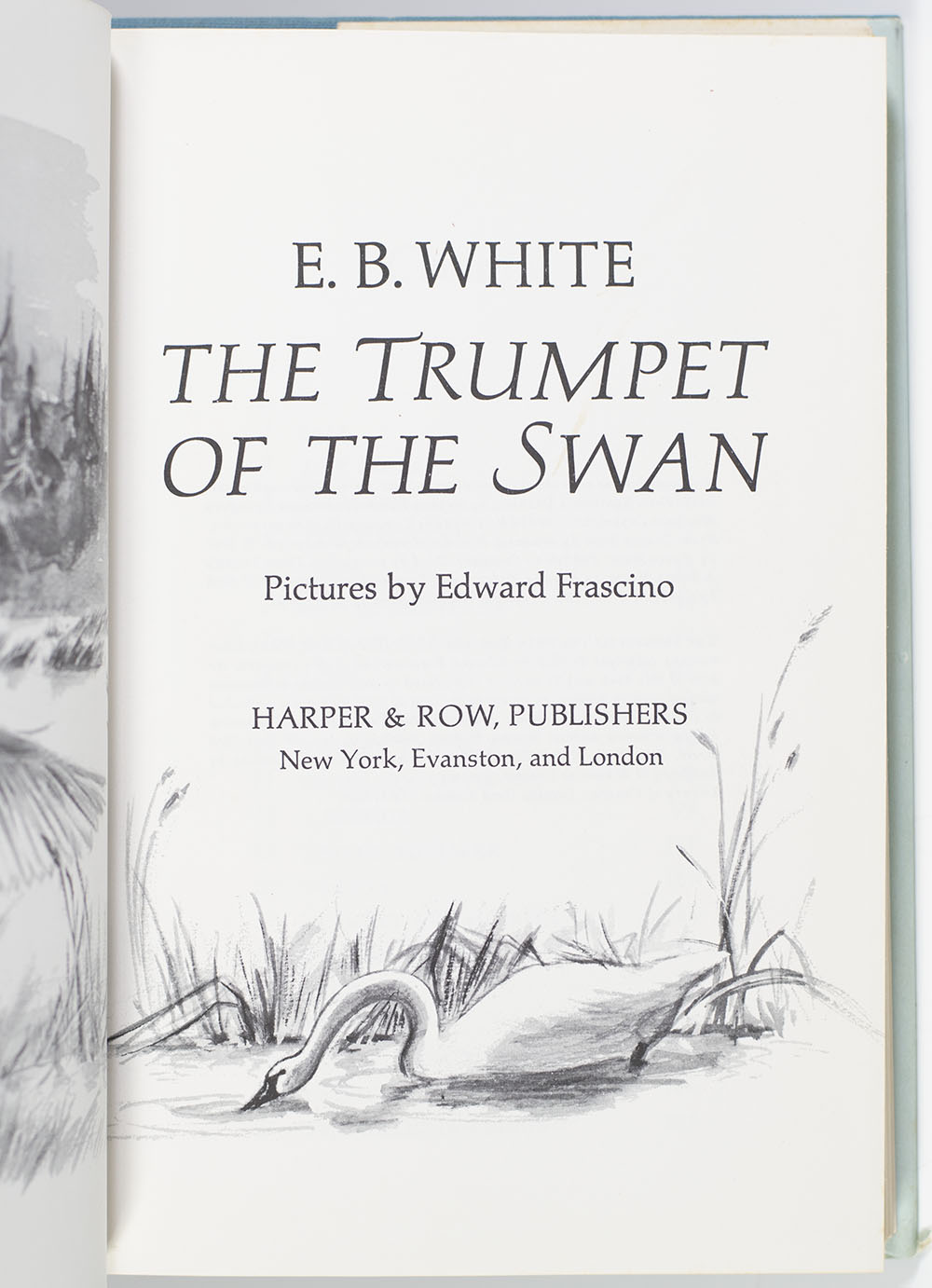 “E.B. White’s last book for children, published almost 20 years after Charlotte’s Web, is the unlikely tale of Louis, a mute trumpeter swan (named for Louis Armstrong), who compensates for his muteness by becoming a virtuoso player of a real trumpet… As he had done with Charlotte’s Web, [White] researched his material thoroughly— making inquiries about everything from the annual migration of trumpeter swans to the workings of the swan boats in the Boston Public Garden— and he wrote the text with the same scrupulous attention to detail… E.B. White has won a place in the hearts of the young forever” (Silvey, 677-78).