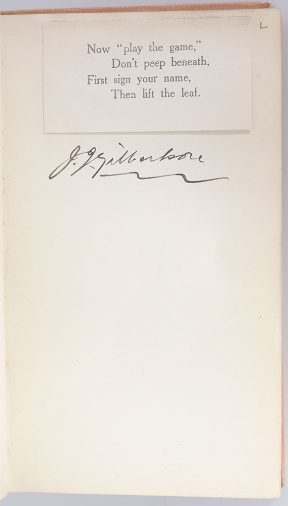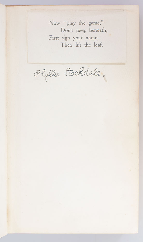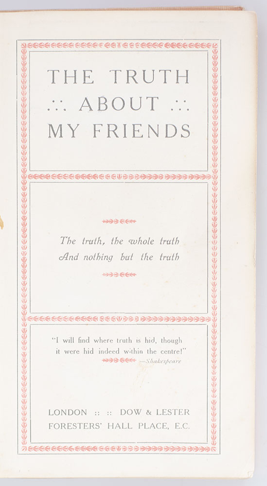 Small parlor game book belonging to Poppy Mackenzie, each page with tipped-in printed slip lifting to reveal a self-criticism or "truth" (one of them being "My sympathies are with the suffragettes"), below which the participants have signed their name. In good condition.