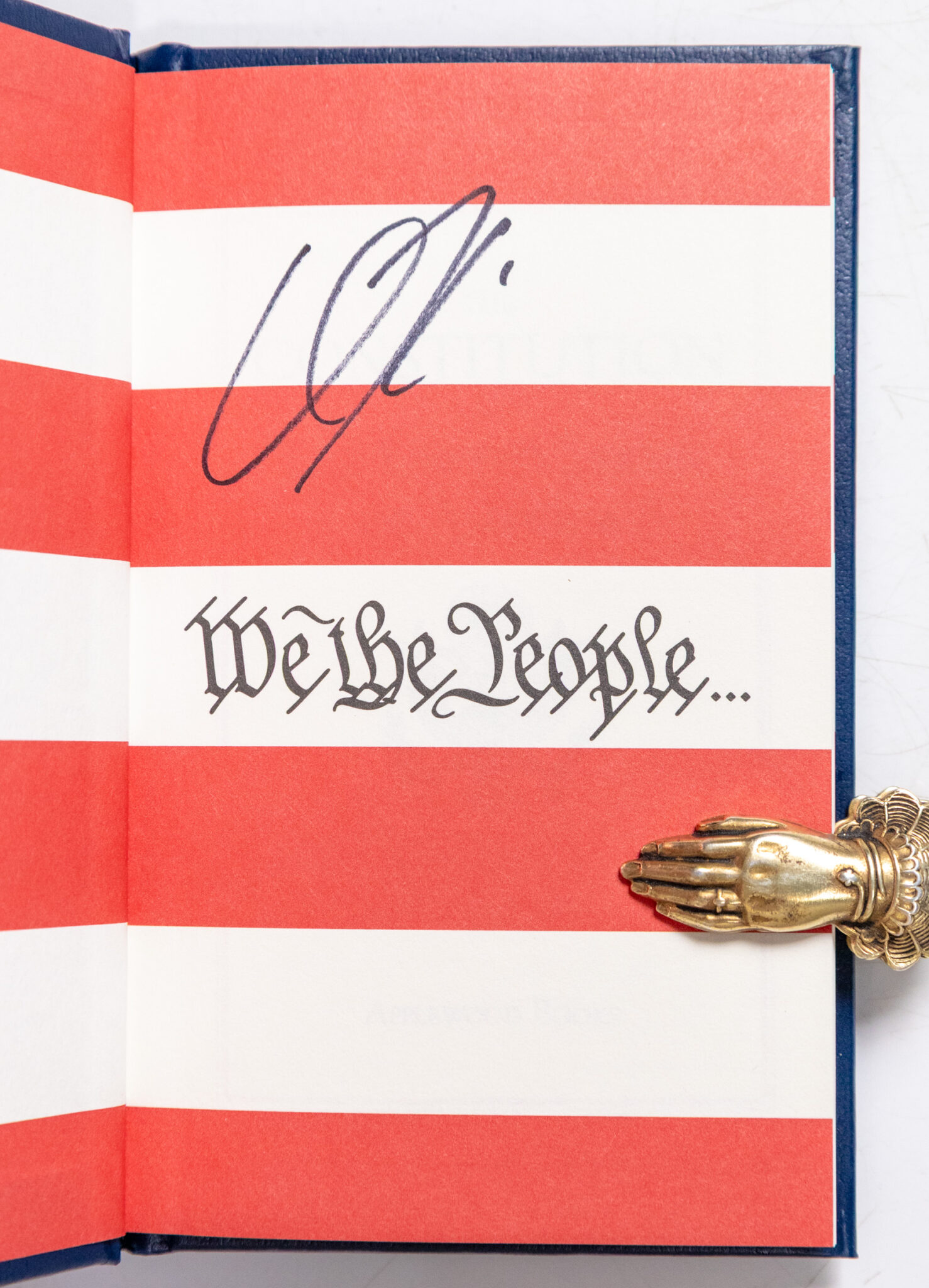 Finely bound example of the Constitution of the United States. Small octavo, bound in full leatherette, illustrated endpapers, all edges gilt. Boldly signed by Charlie Kirk on the front free endpaper. Kirk signed this in Palm Beach in December of 2024. In fine condition. Rare and desirable signed.