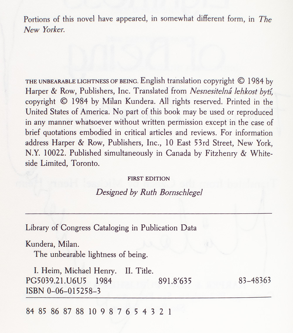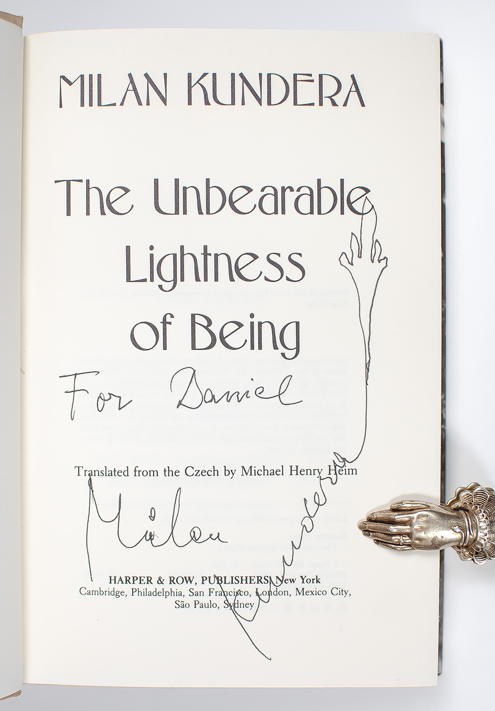First edition of Kundera's magnum opus. Octavo, original half cloth. Presentation copy, inscribed by the author on the title page, "For Daniel Milan Kundera," with an original drawing of a hand attached to the end of the signature. Fine in a fine dust jacket. Jacket design by Fred Marcellino. Translated from the Czech by Michael Henry Heim. Rare signed and inscribed and with an original drawing.