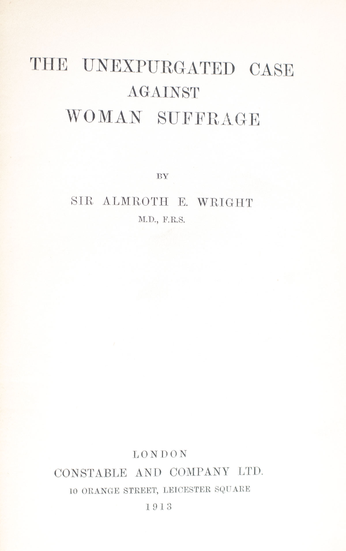 First edition of Sir Almroth E. Wright's The Unexpurgated Case Against Woman Suffrage; Inscribed by Him