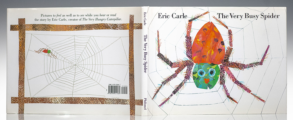Later printing of The Very Busy Spider. Oblong quarto, original publisher’s pictorial boards, patterned endpapers, illustrated. Boldly signed by Eric Carle on the title page. Fine in a fine dust jacket. Jacket illustration done by Eric Carle.