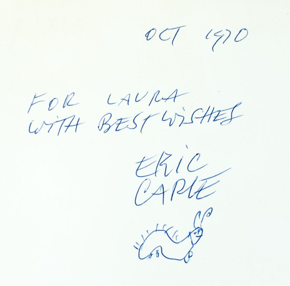 First edition with the number line 1-10 on the copyright page. Oblong quarto, original illustrated boards. Inscribed by the author opposite the title page, "For Laura With Best Wishes Eric Carle Oct 1970." Carle has added a drawing of a caterpillar below his signature.  Fine in a near fine price-clipped (not an issue point) dust jacket. Housed in a custom half morocco clamshell box. Signed and inscribed first editions are extremely rare.