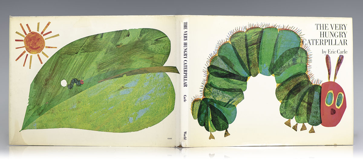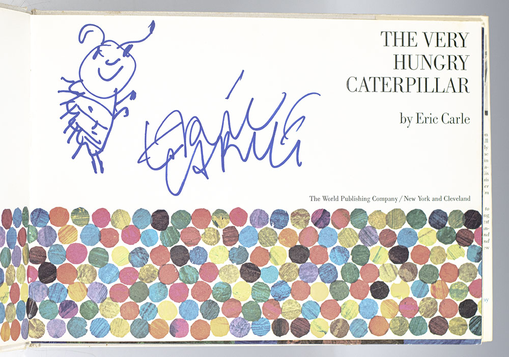 First edition, first printing of Carle's most recognizable work (with the complete number line 1-5 on the copyright page and A3450 on the rear board) in a first issue dust jacket with two paragraphs on the front flap, photograph of Carle with his two children to the rear flap with blurb mentioning only his first book, "1,2,3 to the Zoo", The World Publishing Company New York and Cleveland at bottom of both flaps and A3450 on rear flap (Grolier). Oblong quarto, original illustrated boards. Signed by Eric Carle on the title page with an original drawing of a caterpillar. Fine in a near fine price-clipped dust jacket. Signed first editions are exceedingly rare.