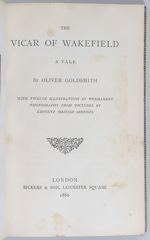 Finely bound example of one of the most popular and widely read novels among Victorians. Octavo, bound in full pebbled morocco with gilt titles and tooling to the spine and panels, gilt turn-ins and inner dentelles, marbled endpapers, all edges gilt, decorated with a fore-edge painting of Squire Thornhill visiting the Primrose family, illustrated. In very good condition with the fore-edge painting exceptionally bright.