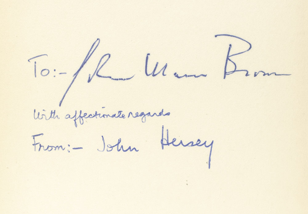 First edition of this classic work. Octavo, original cloth. Presentation copy, inscribed by the author on the front free endpaper, "___ ___ ____ with affectionate regards From- John Hersey." Very good in a very good dust jacket. Jacket design by George Salter. Rare and desirable signed.