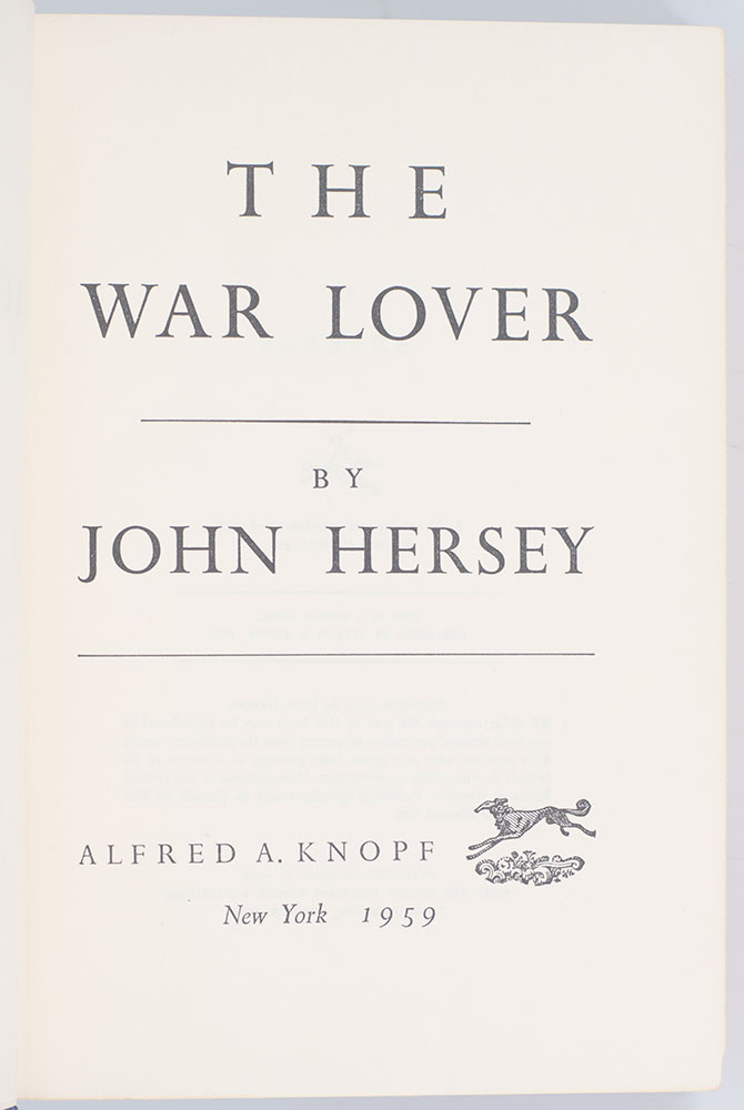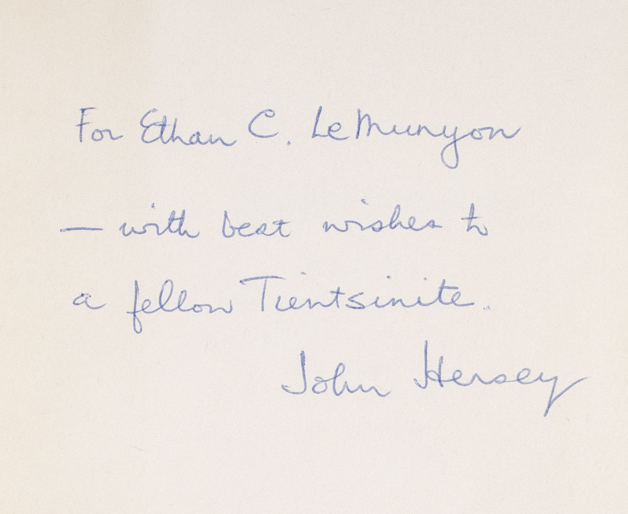 First edition, early printing of this aviation history classic, basis for the 1962 film starring Steve McQueen, Robert Wagner and Shirley Anne Field. Octavo, original cloth. Presentation copy, inscribed by the author on the title page, "For Ethan C. LeMunyon- with best wishes to a fellow Tientsinite. John Hersey." Near fine in a near fine dust jacket. Jacket design by Guy Fleming.