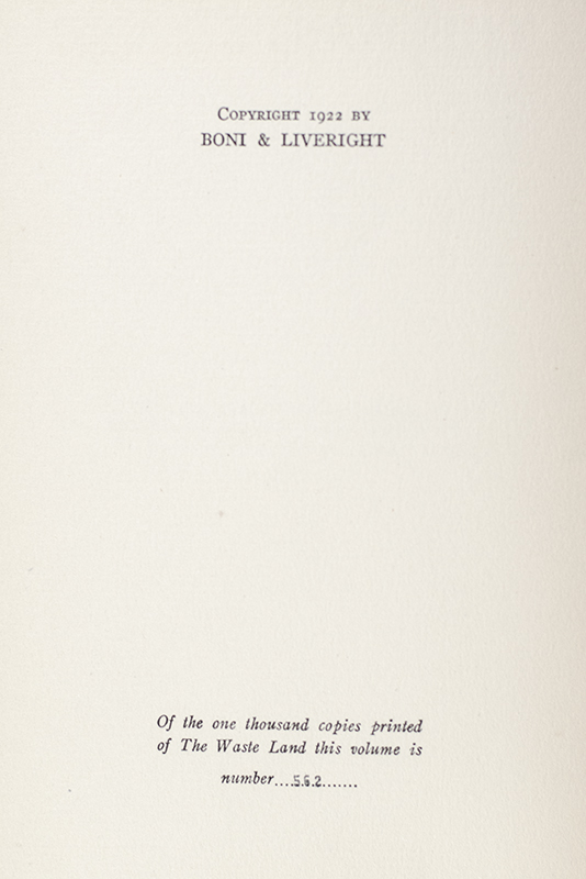 Rare First Edition, First State of T.S. Eliot's The Waste Land; The Eliot Family Copy; Signed by Him