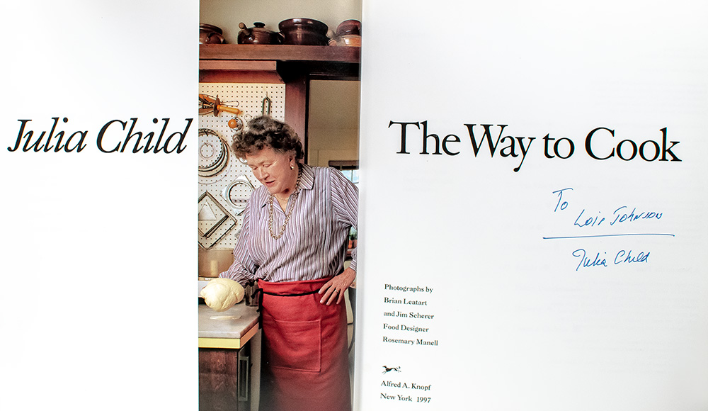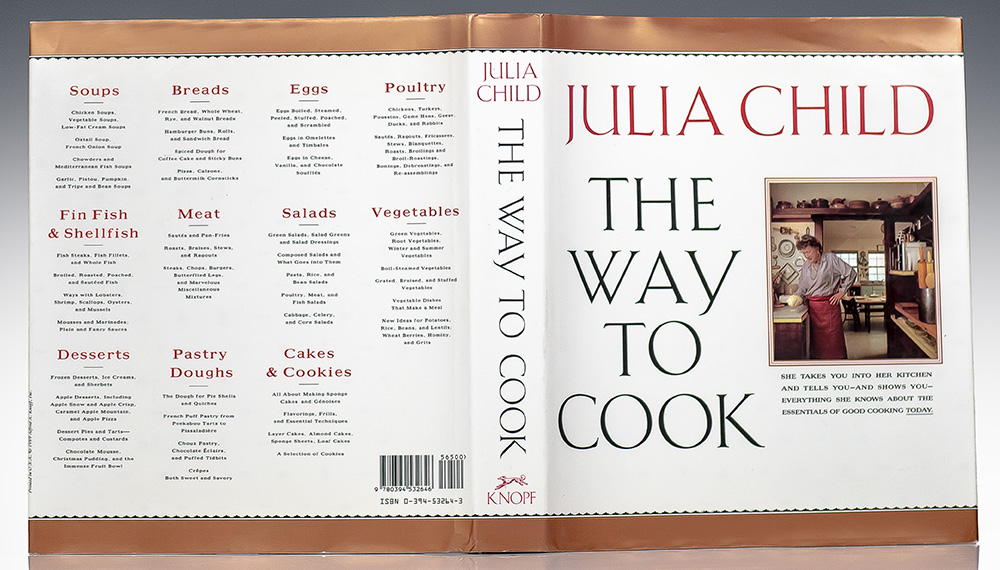 Later printing of this classic cookbook by Julia Child. Quarto, original boards, illustrated with photographs by Brian Leatart and Jim Scherer. Presentation copy, inscribed by the author on the title page, "To Lois Johnson Julia Child." Fine in a near fine dust jacket. Jacket design by Carol Devine Carson.