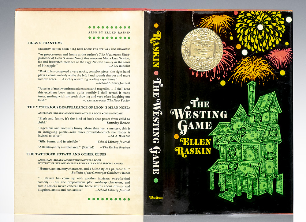 In Raskin's Newbery Award-winning mystery The Westing Game, wealthy industrialist Sam Westing dies and, in his will, calls for his sixteen heirs to meet at his mansion where he sets out a game in which they are paired out with a set of clues and $10,000 with which they are challenged to determine who killed Westing and why. The book went on to win the Newbery Medal, the Boston Globe/Horn Book Award and was an ALA Notable Book. It was ranked number nine among all-time children's novels in a survey published by School Library Journal in 2012. It has been adapted as the 1997 feature film Get a Clue.