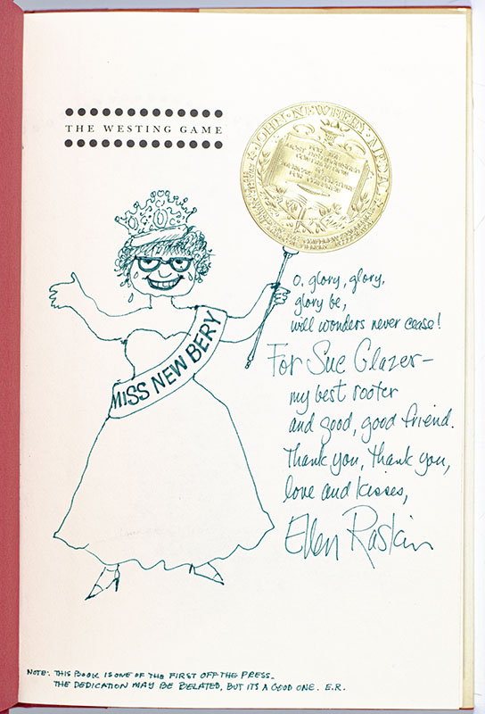 First edition of Raskins's Newbery Award winning novel. Octavo, original cloth. Association copy, lengthily inscribed by the author on the half-title page with a drawing of a self-caricature, "O, glory, glory, glory be, will wonders never case! For Sue Glazer - my best rooter and good, good friend. Thank you, thank you, love and kisses, Ellen Raskin." Raskin has added a full-page caricature of herself donning a gown, tiara and "Miss Newbery" sash holding a large scepter with the gold Newbery seal as the globe. She has also added a footnote at the bottom of the page which reads, "Note: This book is one of the first off the press - the dedication may be belated, but it is a good one. E.R." The recipient, Dr. Susan Mandel Glazer was the author's closest friend and an internationally recognized literary advocate and taught at Rider University for an impressive 45 years. Scarcely seen inscribed, let alone with a self-caricature and such an intimate association.