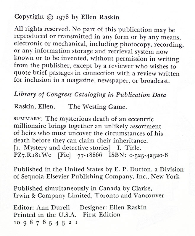 Rare First Edition of Ellen Raskin's Newbery-Award Winning Novel The Westing Game; Lengthily Inscribed by Her to her Closest Friend