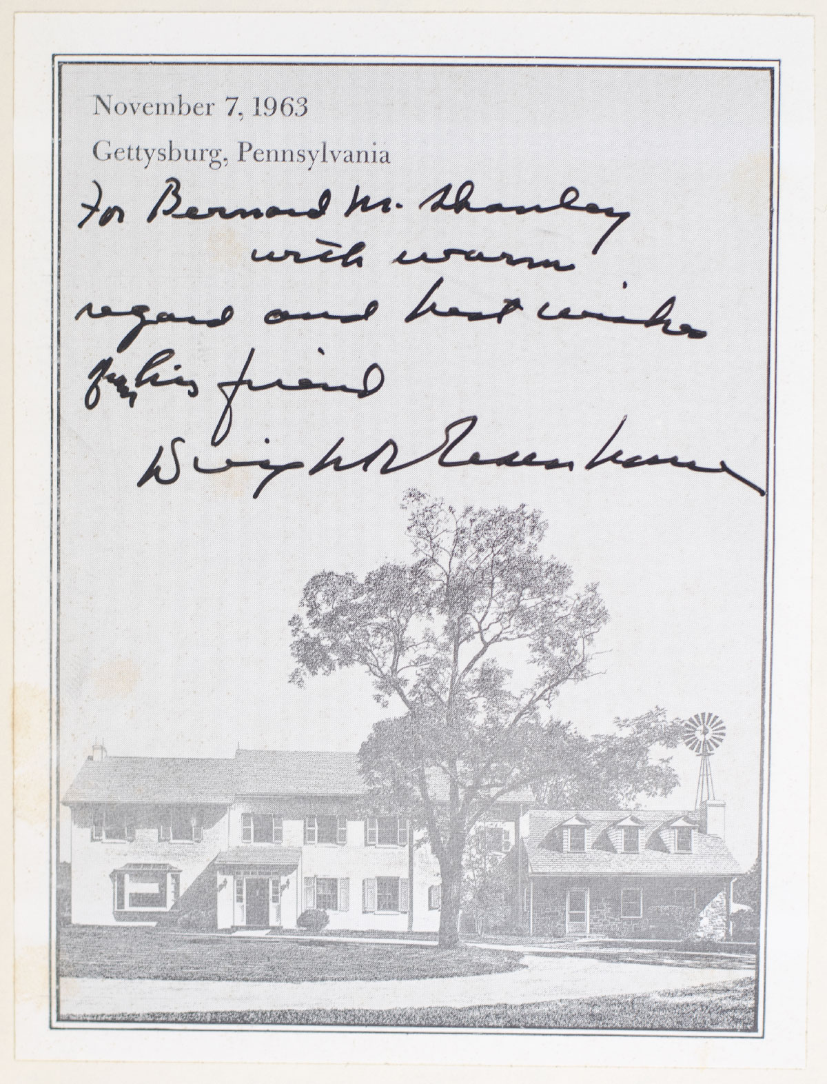 First edition of volume one of President Eisenhower's memoirs. Octavo, original cloth, pictorial map endpapers. Presentation copy, inscribed opposite the half-title page by the author on a Gettysburg bookplate dated November 7, 1963, "For Bernard M. Stanley with warm regard and best wishes from his friend Dwight D. Eisenhower." Fine in a very good dust jacket. Housed in a custom half morocco clamshell box by Asprey.