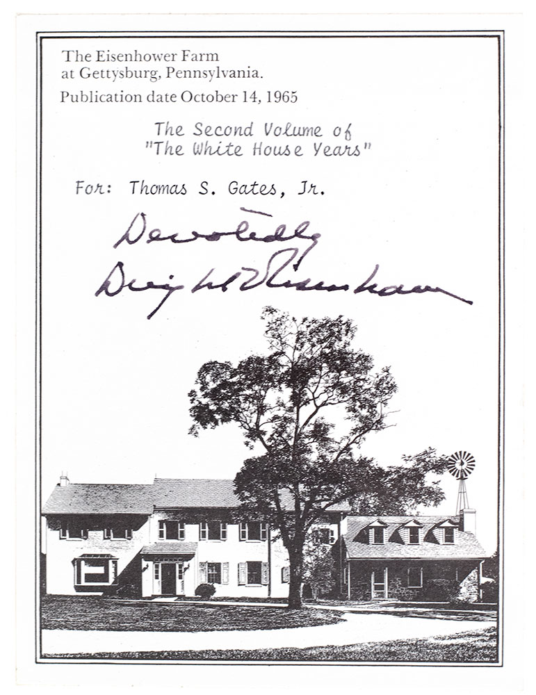 Signed limited first editions of Eisenhower's memoirs, each one of 1500 copies. Thick Octavo, two volumes, original tan cloth with green morocco spine labels lettered in gilt, cartographic endpapers. One of 1500 numbered copies signed by the author. Association copy, Waging Peace is an Advance presentation copy, inscribed by Eisenhower to Secretary of Defense, Thomas S. Gates, Jr., "Devotedly Dwight D. Eisenhower" on an Eisenhower Farm, Gettysburg, Pennsylvania bookplate. The recipient, Thomas S. Gates is mentioned numerous times in both of these volumes. "To replace Neil McElroy as Secretary of Defense I prevailed on Secretary of the Navy Tom Gates to delay his return to private life. He first took the post of Deputy Secretary for the duration of Mr. McElroy's term and then in December assumed the post of Secretary of Defense. During his term as Secretary he had the satisfaction of seeing the Polaris, developed by the Navy under his leadership, make its first successful firings and join America's growing arsenal." (p. 254, The White House Years: Waging Peace 1956-1961). Fine in the original acetate dust jackets. An exceptional association.