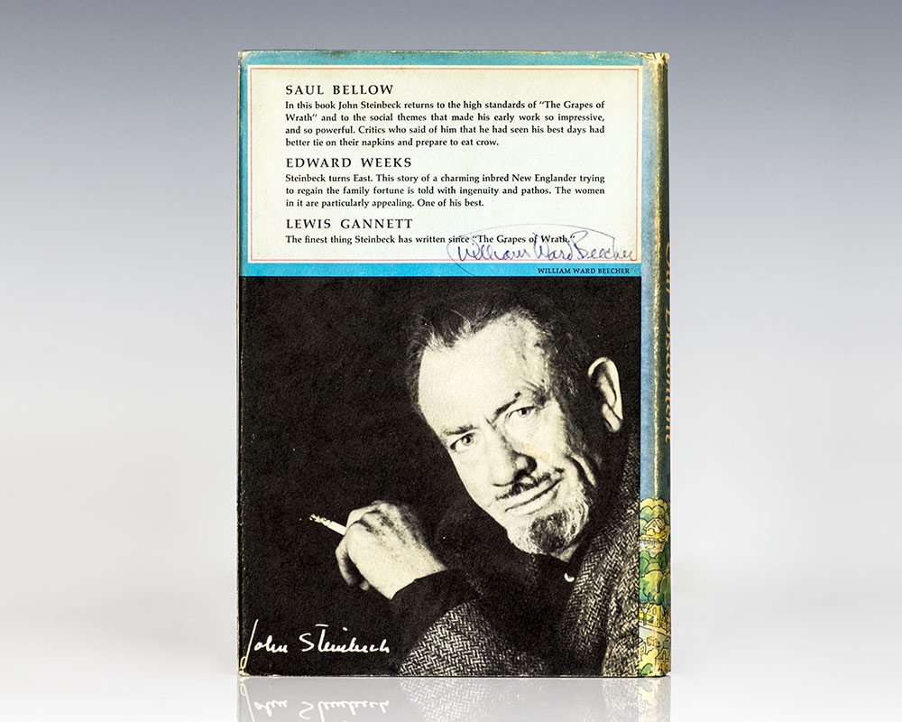 First edition of Steinbeck's final novel, which along with The Grapes of Wrath are considered his masterpieces. Octavo, original cloth. Presentation copy, inscribed by the author on the front free endpaper in the year of publication, "For Betty Beecher, with all the best John Steinbeck Sag Harbor 1961." The photograph of Steinbeck on the rear panel of the dust jacket is by William Ward Beecher (the husband of Betty) who has signed his name on the rear panel. Also laid in is a small clipping from the brown wrapping paper in which the book was shipped, in the author's handwriting "From John Steinbeck Box 1017 Sag Harbor NY." Some light dampstaining in a very good dust jacket. Jacket design by Elmer Hader. Lettering by Jeanyee Wong. Photograph by William Ward Beecher. Housed in a custom half morocco clamshell box. Presentations copies of Steinbeck's masterpiece are rare.