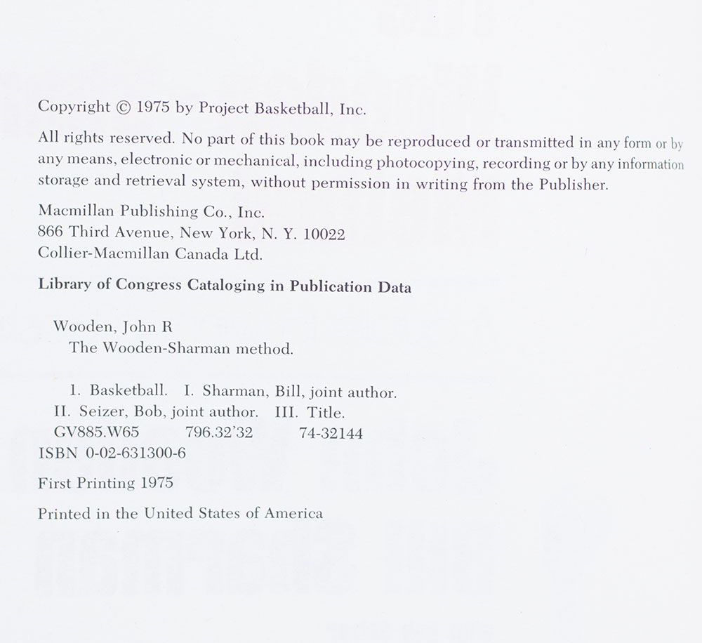 First edition of this work by the legendary hall of famers. Quarto, original cloth, illustrated. Presentation copy, inscribed by both authors on the front free endpaper, "For Terri- with best wishes John Wooden and "To Terri Very best wishes! Sincerely! Bill Sharman." Fine in a near fine price-clipped dust jacket.