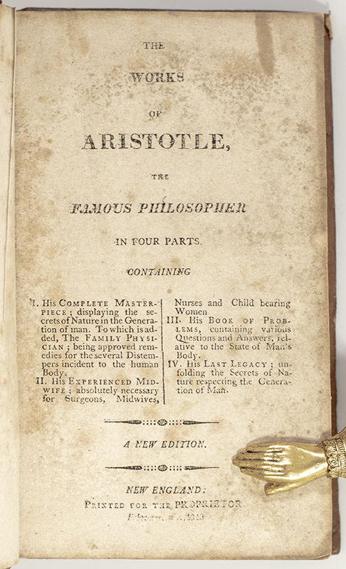 New edition of this early New England printing of the works of Aristotle. Octavo, bound in full period calf, morocco spine label lettered in gilt, illustrated with four woodcut engravings. In very good condition.