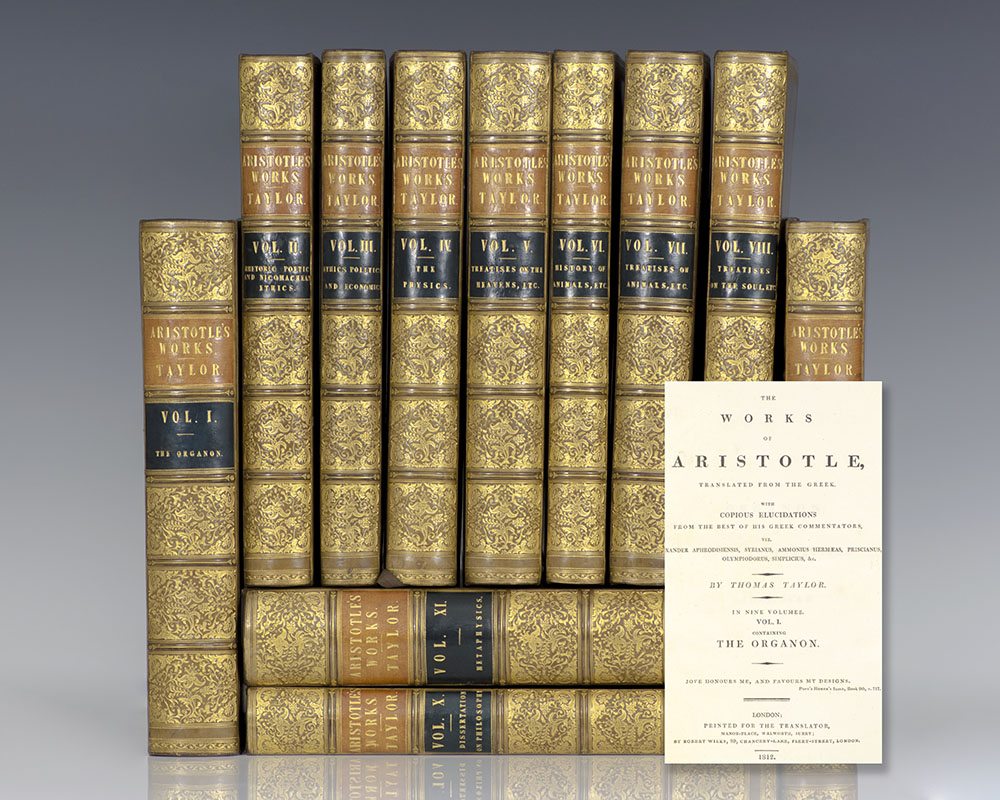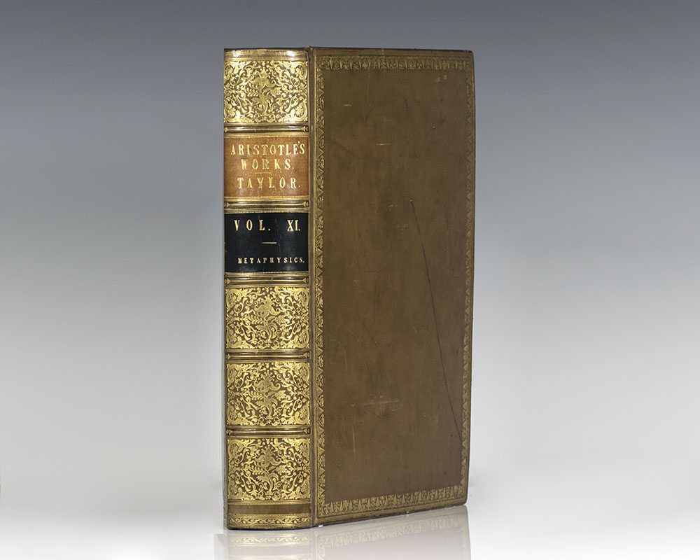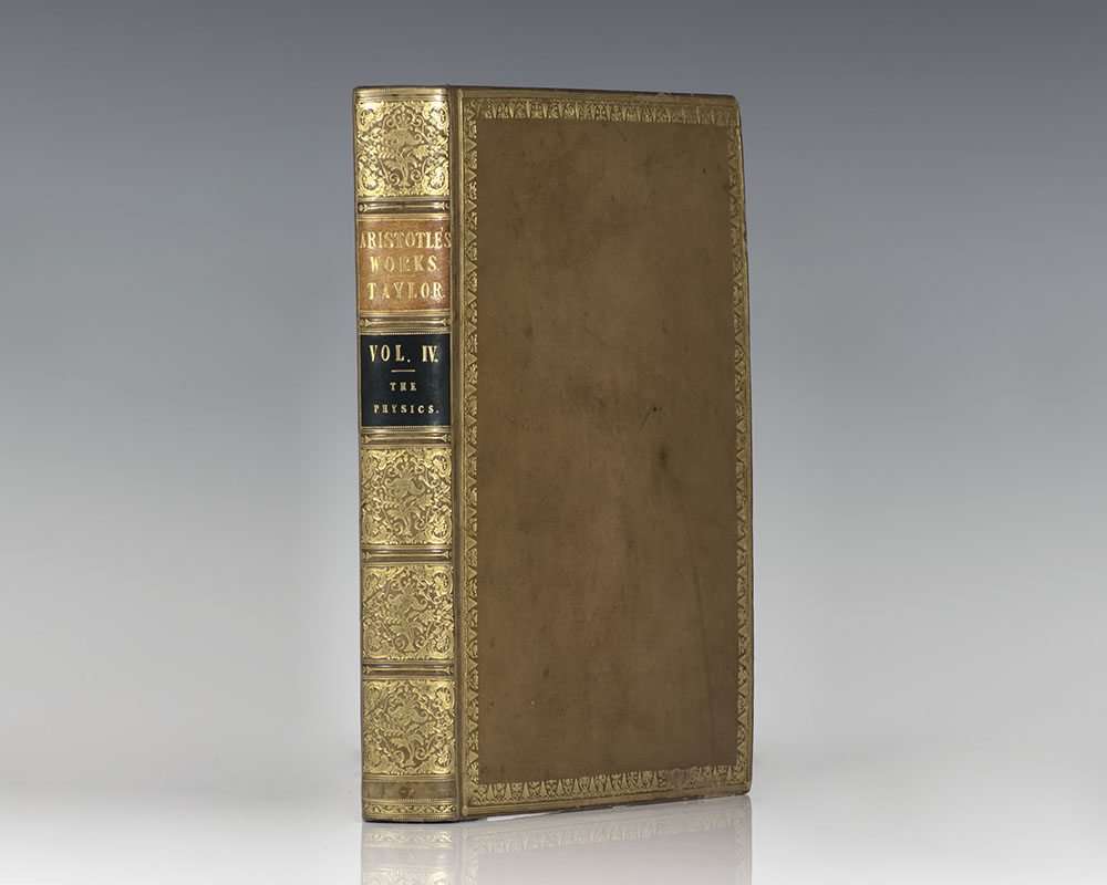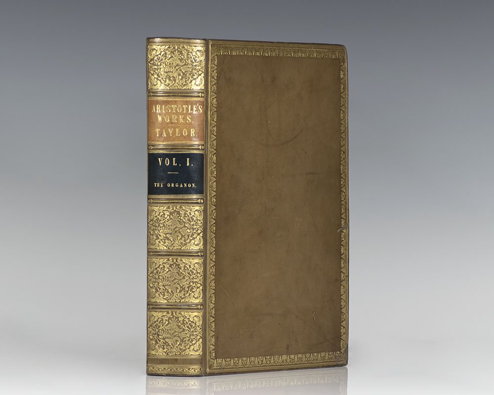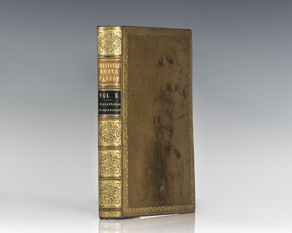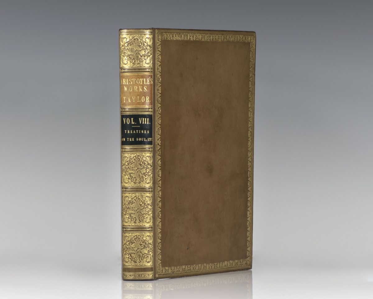 Exceptionally rare complete set of the first edition in English of the works of Aristotle, limited to only 50 sets. Quarto, 11 volumes. Bound in full contemporary calf by J. Mackenzie, Bookbinder to the King. Gilt leaf and flower borders on covers, gilt titles and tooling to the spine, morocco spine labels, ribbon book marks bound in, marbled endpapers, all edges gilt. The set composes of the following: Volume 1: The Organon, 1807, signed at the end by the translator Thomas Taylor, and with A Brief Notice of Mr. Thomas Taylor, the Celebrated Platonist, with a Complete List of his Published Works, by J.J. Welsh. Volume 2: The Rhetoric, Poetic, and Nichomachean Ethics, 1811. Volume 3: The Great and Eudemian Ethics, the Politics and Economics Volume 4: The Physics, 1806, signed by Thomas Taylor on the last page. Volume 5: The Treatises on the Heavens, on Generation, and Corruption, and on Meteors, 1807, folding plate of mathematical figures. Volume 6: The History of Animals and Treatise on Physiognomy, 1809. Volume 7: The Treatises on the Parts, and Progressive Motion of Animals, Problems; and His Treatise on Individual Lines, 1810. Volume 8: The Treatises on the Soul; on Sense and Sensibilities; on Memory and Reminiscence; on Sleep and Wakefulness; on Dreams; on Divination by Sleep; on the Common Motion of Animals; on the Generation of Animals; on the Length and Shortness of Life; on Youth and Old Age, Life and Death; and on Respiration, 1808. Volume 9: The Metaphysics, 1812. Volume 10: A Dissertation on the Philosophy of Aristotle, by Thomas Taylor, 1812. This set includes an 11th volume being Taylor's first edition of The Metaphysics, 1801 containing an extensive introduction and notes. Lowndes, p. 68: "Of this valuable translation, the only complete one extant in the English language. Fifty copies only were printed at the expense of William Meredith, Esq." In near fine condition with only light toning. Complete sets are of the utmost rarity; rare and desirable set of this landmark work.