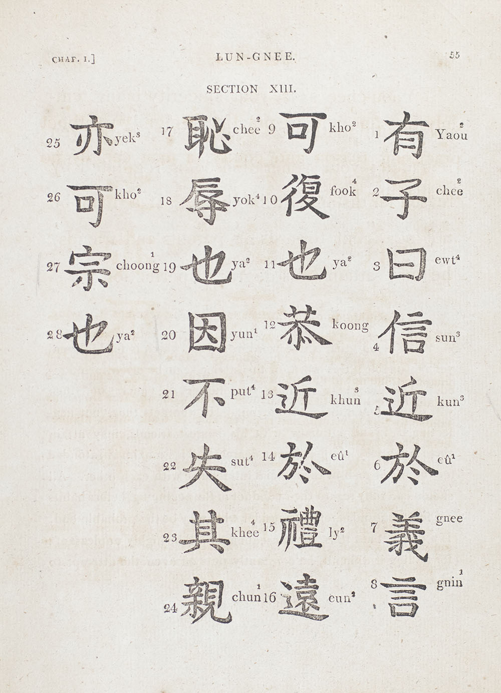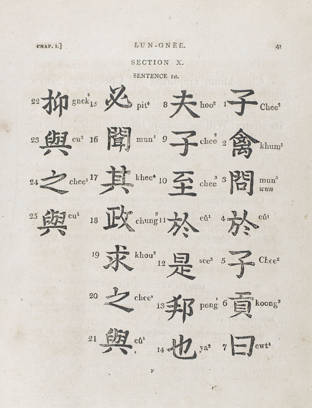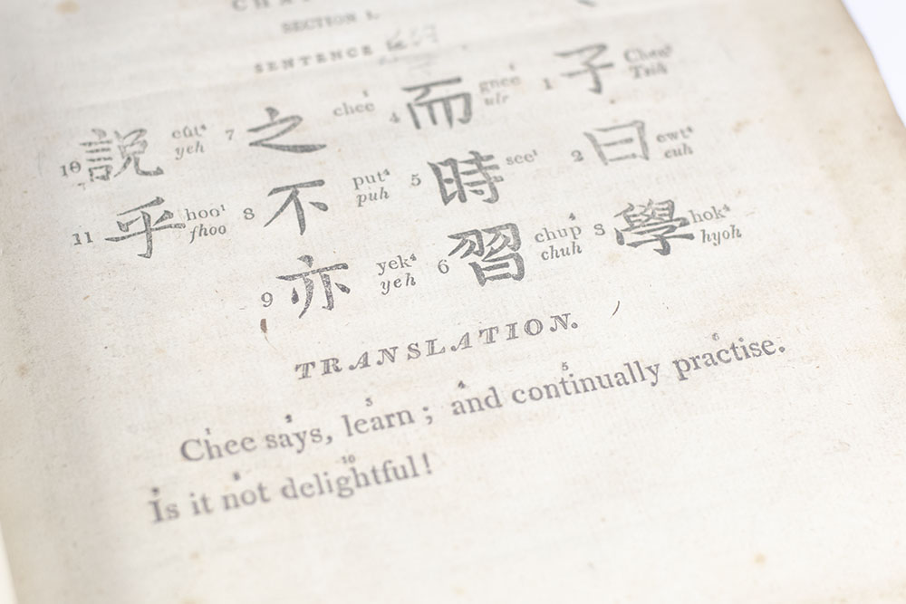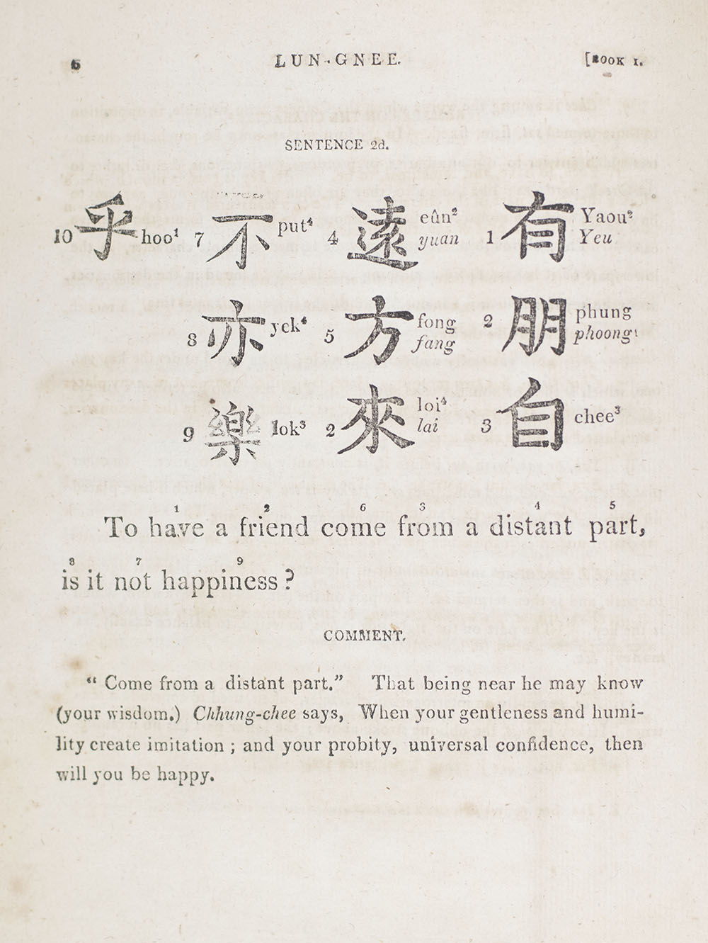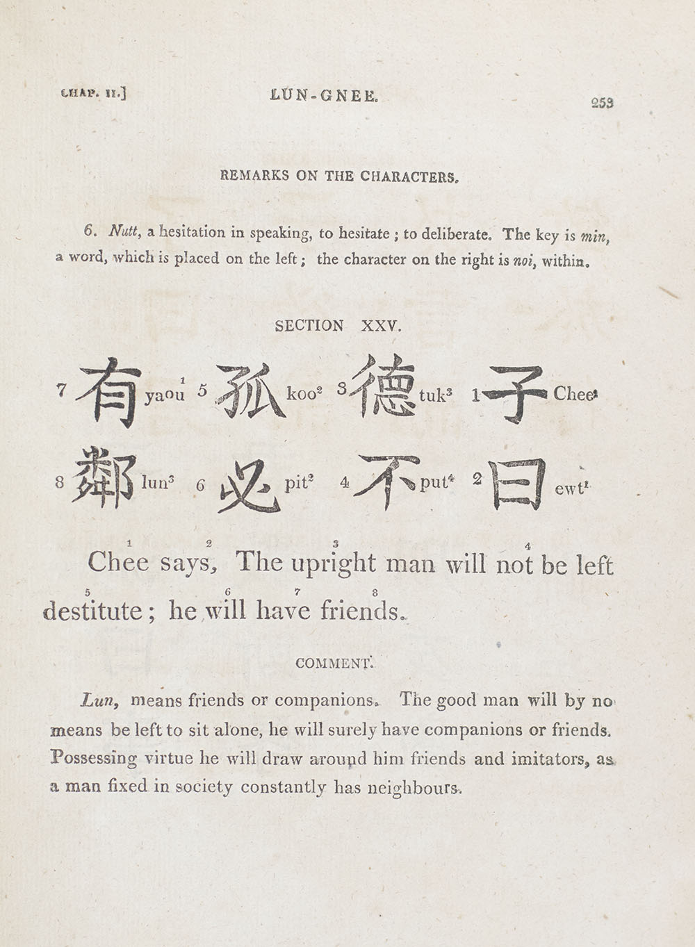 The first English translation of the Analects (Lunyu) of Confucius, Baptist missionary Marshman's translation contains the first five of twenty books and was printed at Serampore, the first major center of English printing in Chinese. The first complete translation by James Legge was published decades later in 1861. A collection of sayings attributed to Confucius, the Analects were likely compiled posthumously by his followers. The Analects' reputation grew to surpass that of the Five Classics and became one of the texts underpinning the Confucian system which held sway over China for two millennia. Joshua Marshman, William Carey, and William Ward established a Baptist mission and press at Danish-controlled Serampore in 1800, beyond the control of the East India Company. The Company discouraged missionary activity and maintained a policy of press censorship within its territories. Marshman and his fellow missionaries had ambitious plans for proselytizing across Asia, and he had studied Arabic, Greek, Hebrew, Latin, and Syriac before he even reached India. In India, he first learned Bangali and Sanskrit. Next, he turned to Chinese, which he studied intensively under the guidance of Johannes Lassar, scion of a wealthy Armenian trading family in Macao, and assisted by several Chinese tutors. This book dates from the first phase of Chinese language printing in Serampore, with Chinese character printed using woodblock characters carved by Bengali textile workers, whose carved woodblocks were employed to print patterns onto calico. The second phase would only being in 1813 when moveable metal type replaced woodblocks, which enormously increased efficiently, as it permitted many more impressions. The Chinese publications for the Mission Press were principally evangelical; Lassar and Marshman translated large sections of the Old and New Testaments into Chinese, and saw Serampore as an ideal position from which to spread the Chinese gospel, free from imperial Chinese censorship. The East India Company too was increasingly interested in the study of Chinese for political reasons. Their Indian territories abutted the Chinese forts in Tibet, and the memory of Macartney's diplomatic failure in 1792 remained fresh. Another diplomatic mission would require translators, and the Company had no competent Chinese interpreters in India at the turn of the century. Marshman dedicated this work toe the Governor-General of Bengal, Lord Minto, who subsidized the cost of printing in Chinese at Serampore, despite his personal hostility to missionary activity with British India.