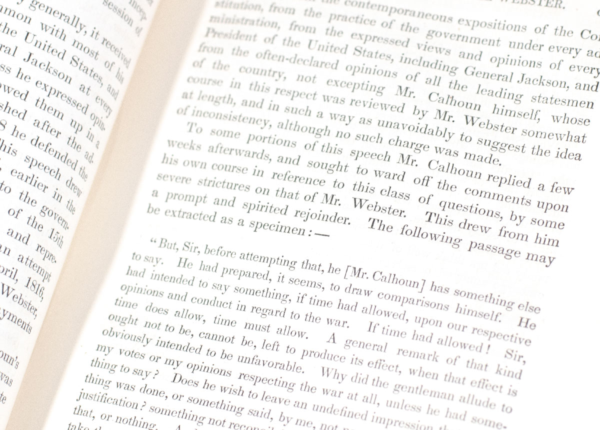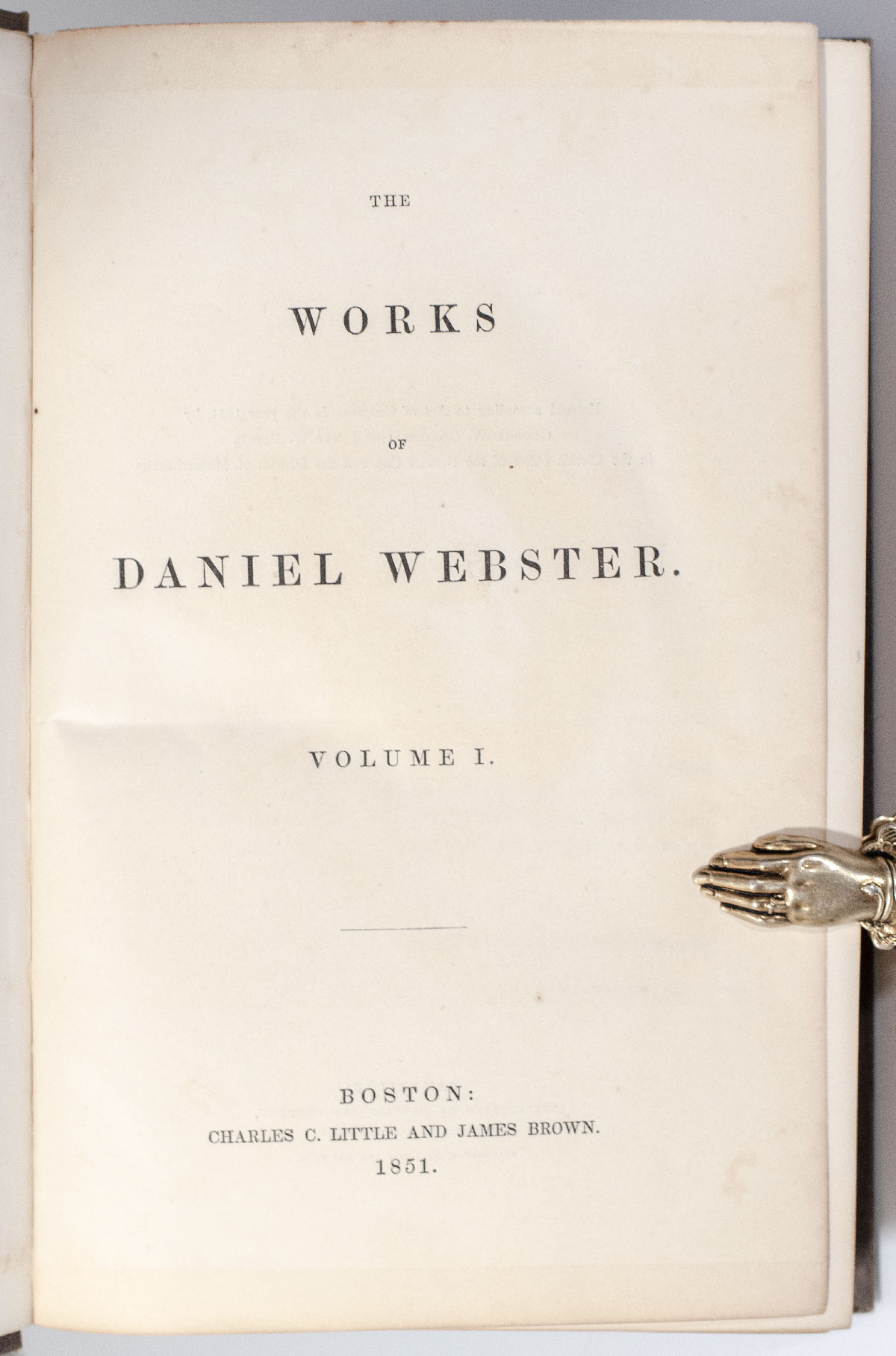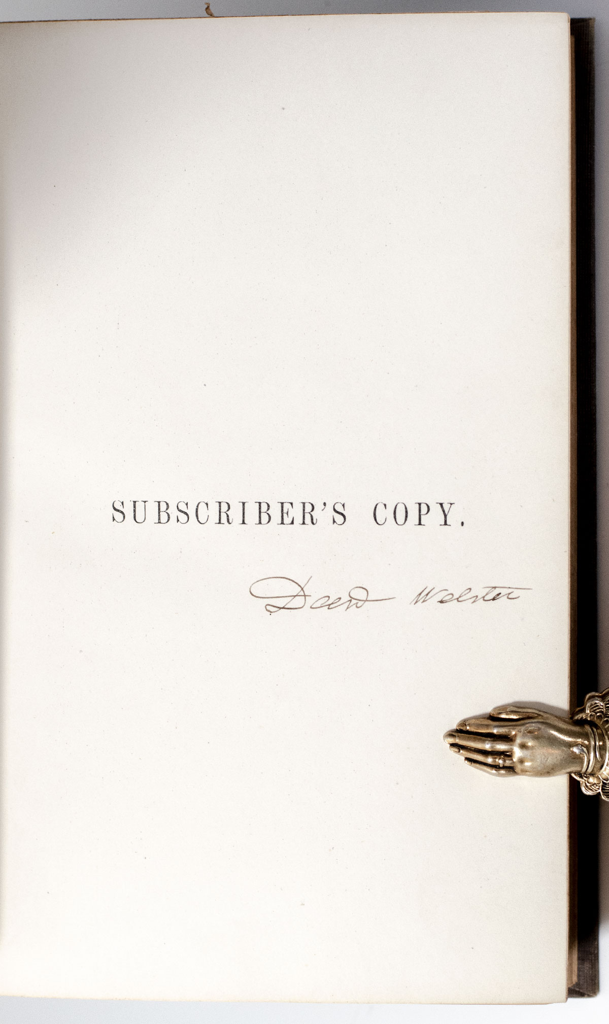 The subscriber's edition of the works of Daniel Webster, signed by Webster in the first volume. Octavo, 6 volumes, bound in original cloth, frontispiece, and one other plate. In near fine condition.
