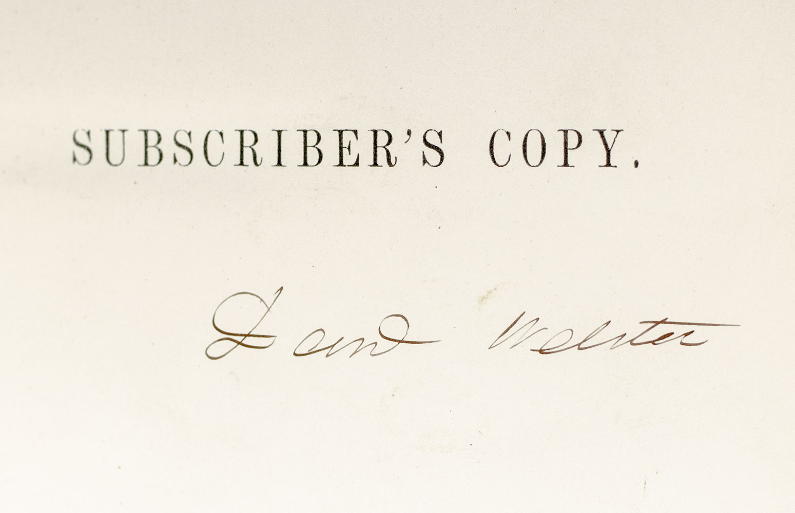 The subscriber's edition of the works of Daniel Webster, signed by Webster in the first volume. Octavo, 6 volumes, bound in three quarters morocco, gilt titles and tooling to the spine, raised bands, gilt topstain, extra illustrated with 12 autograph letters, documents, and notes by Webster and others, including one printed ship's passport signed by Millard Fillmore, as President, and Webster, as Secretary of State, as well as 70 additional engraved portraits and views. In near fine condition. An exceptional presentation, rare and desirable signed.