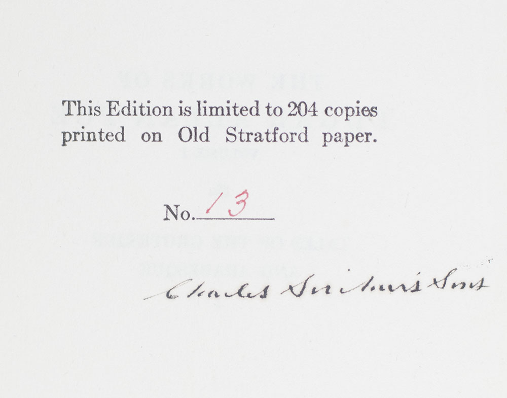 Signed edition of this finely bound set of the works of Edgar Allan Poe, number 13 of 204 copies signed by the publisher. Octavo, 10 volumes, bound in three quarters morocco gilt by Stikeman for Scribner's, gilt titles and tooling to the spine. In fine condition. An exceptional set.