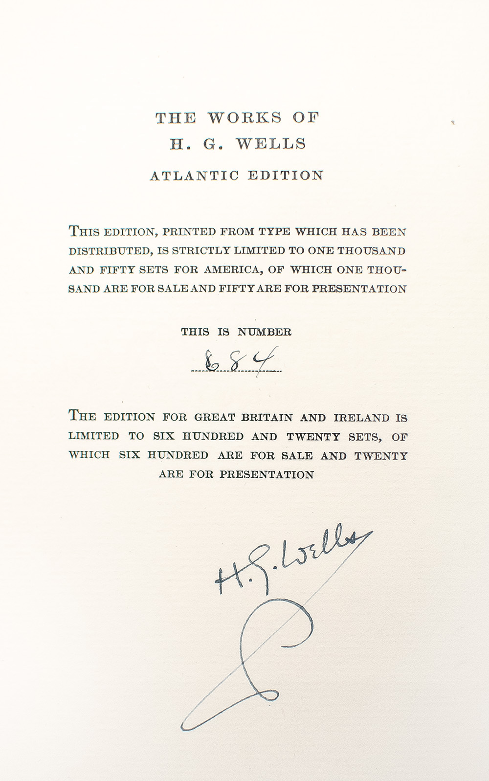 The Atlantic edition, one of only 1050 copies, signed by H.G. Wells in volume one, this is number 684. Octavo, 28 volumes, bound in three quarters morocco by Stikeman & Co., gilt titles and tooling to the spine with floral detailing, top edge gilt, tissue-guarded frontispiece illustrations including the author portrait in volume one. In near fine condition. An exceptional set.