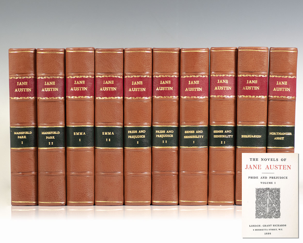The Winchester edition of the novels of Jane Austen containing each of her major works. Octavo, 10 volumes bound in three quarters crushed levant morocco with morocco spine labels lettered in gilt, tissue-guarded engraved frontispiece portrait of Austen to the first volume, top edge gilt. Contains Pride and Prejudice, Sense and Sensibility, Northanger Abbey, Persuasion, Mansfield Park, and Emma. In near fine condition.